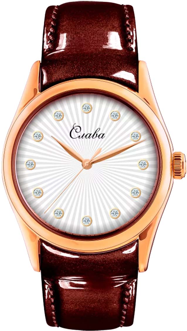 Сенат. Женские наручные часы. Стальной круглый корпус. Циферблат защищен прочным сапфировым стеклом. Листовидные стрелки в стиле Feuille. Метки в виде точек, украшенных цирконовыми кристаллами. Рифленая заводная головка. Удобный ремешок из натуральной кожи с классической застежкой.