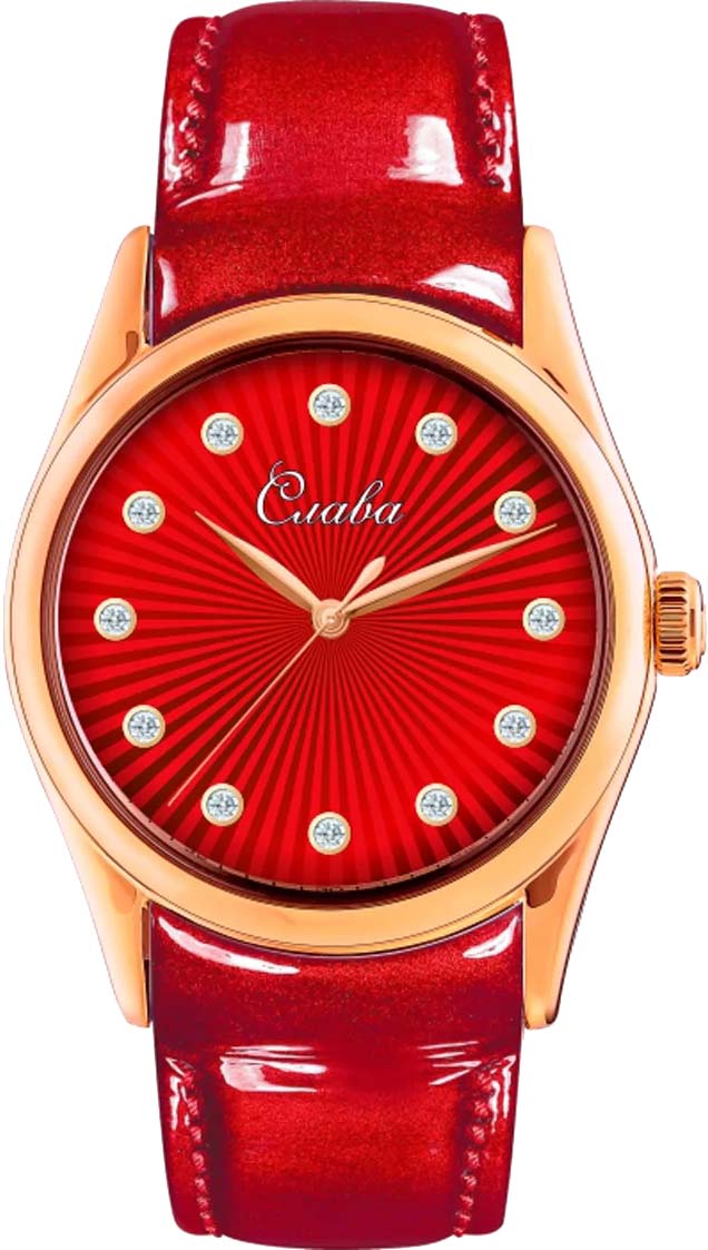 Сенат. Женские наручные часы. Стальной круглый корпус. Циферблат защищен прочным сапфировым стеклом. Листовидные стрелки в стиле Feuille. Метки в виде точек, украшенных цирконовыми кристаллами. Рифленая заводная головка. Удобный ремешок из натуральной кожи с классической застежкой.