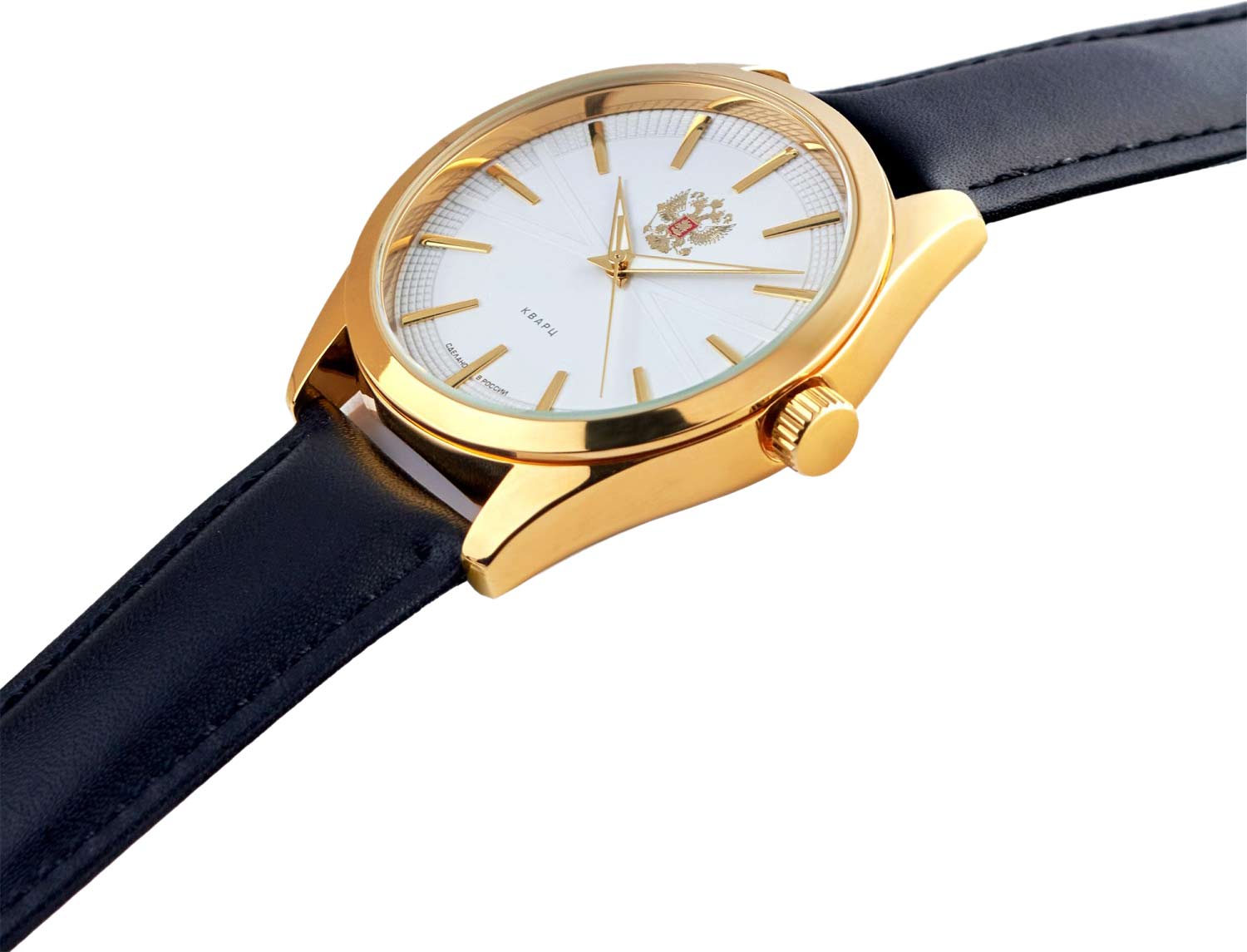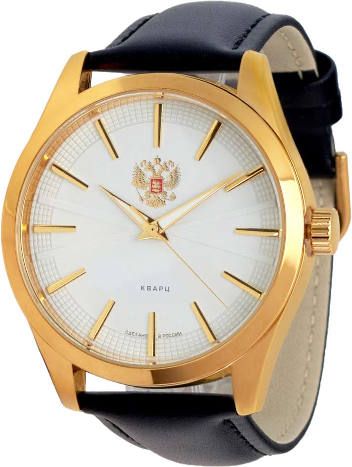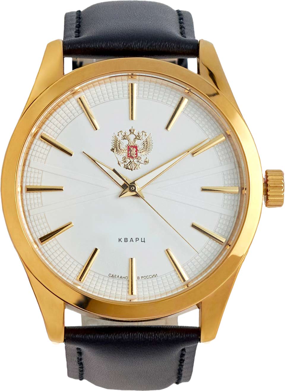 Унисекс часы с круглым корпусом. Циферблат украшен гербом России и защищен прочным минеральным стеклом. Метки в виде штрихов. Рифленая заводная головка. Удобный кожаный ремешок с классической застежкой.