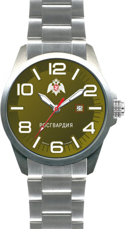 Эти практичные часы с эмблемой государственных силовых подразделений на циферблате великолепно сидят на руке и позволят вам чувствовать себя уверенно в любой обстановке. Коричневый циферблат с метками в виде штрихов и арабских цифр. Окошко даты. На циферблате символика Росгвардии. Заводная головка с защитой. Круглый корпус. Завинчивающаяся задняя крышка. Стальной браслет с раскладывающейся застежкой.