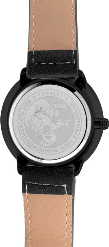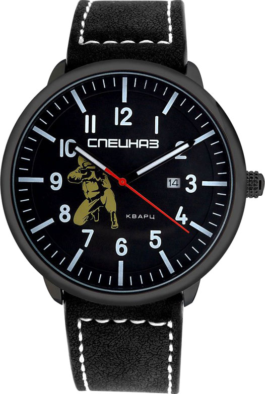 Российские часы придутся по вкусу ценителям практичных и стильных аксессуаров. Идеальный выбор для современного ритма жизни. На циферблате надпись «Спецназ» и изображение бойца спецподразделения. Окошко даты. Круглый корпус. Задняя крышка из нержавеющей стали. Ремешок из натуральной кожи прошит белой нитью.