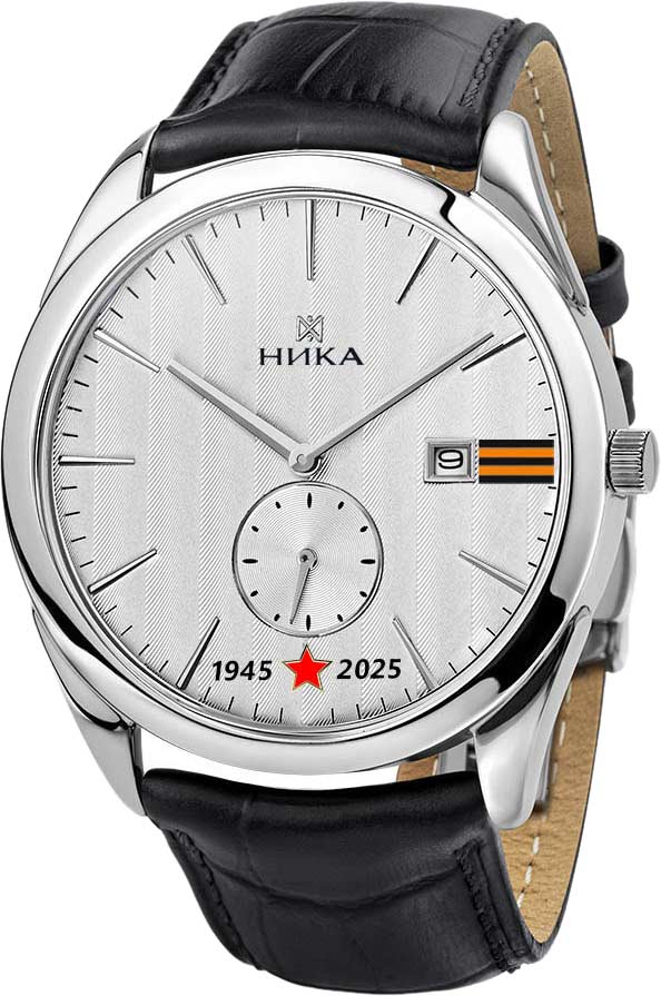 Мужские наручные часы. Круглый корпус из серебра 925 пробы. На гильошированном циферблате размещены юбилейные даты 1945–2025. Метки в виде штрихов. Секундная стрелка вынесена на отдельный циферблат. Окошко даты с символом Георгиевской ленты находится в положении 3 часа.