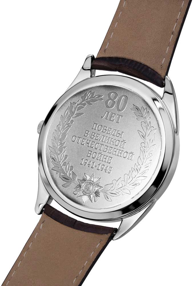 Рифленая заводная головка. Задняя крышка с гравировкой «80 лет Победы в Великой Отечественной Войне 1945–2025». Кожаный ремешок с раскладывающейся застежкой. Производитель оставляет за собой право вносить изменения во внешний вид часов.