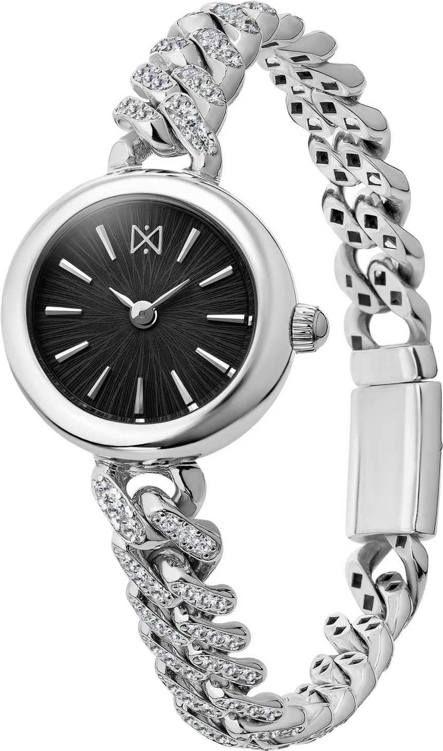 Женские часы с круглым серебряным корпусом Viva. Циферблат с метками в виде штрихов украшен узором. Рифленая заводная головка. Браслет-цепочка с панцирным плетением. Застежка украшена фирменным логотипом. Производитель оставляет за собой право вносить изменения во внешний вид часов.