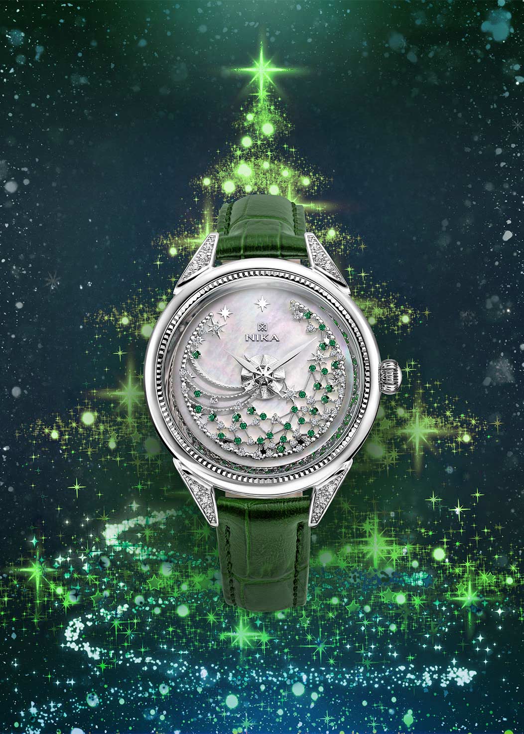 Часы оснащены двухуровневым циферблатом: статичная цветовая основа и ажурный серебряный диск с фианитами, приводимый в движение подшипником и реагирующий на движение запястья. Вращающийся диск создает эффект живого света. В центре — звезда Nova, визуальный и инженерный акцент конструкции.