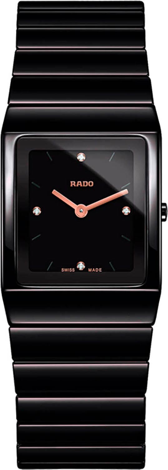 Высококачественные швейцарские женские часы Ceramica Diamonds. Прямоугольный керамический корпус. Матовый циферблат с метками в виде штрихов и точек, украшенных бриллиантами. Прямоугольные стрелки в стиле Baton. Гладкая заводная головка. Надежный керамический браслет с раскладывающейся застежкой.