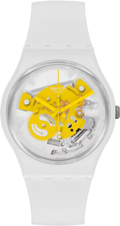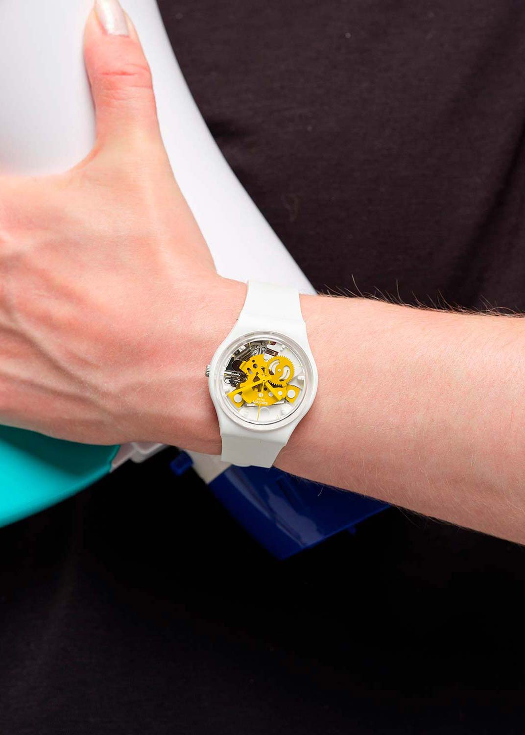 Яркий дизайн часов станет завершающим штрихом в вашем повседневном образе. Кварцевые скелетонизированные наручные часы унисекс с ярким желтым механизмом Time To Yellow Small. Круглый корпус из матовой белой керамики Bioceramic. Рифленая заводная головка. Ремешок с классической застежкой.