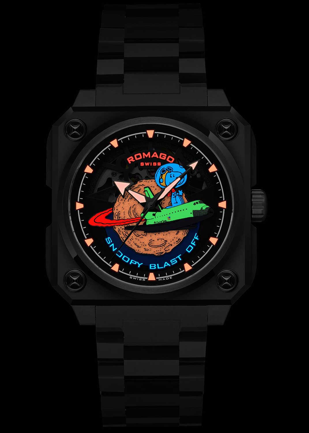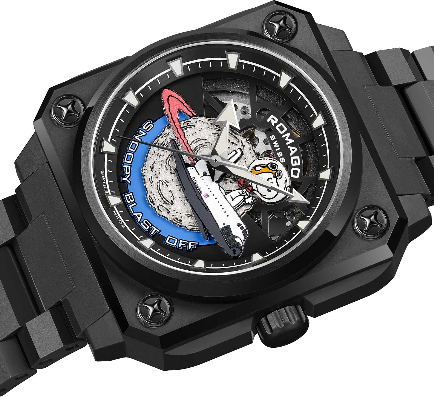 Romago X Snoopy. Лимитированная серия. Скелетонизированные унисекс часы. Модель посвящена Snoopy (Снуппи) — персонажу из серии популярных комиксов Peanuts, который в своих мечтах был пилотом. Запас хода до 36 часов. Ротор механизма расположен на циферблате. Корпус выполнен из керамики.