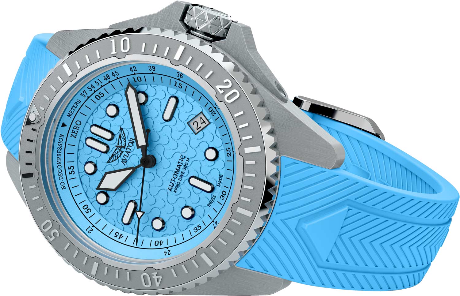 Циферблат с глубоким матовым покрытием и текстурой. Метки в виде точек и штрихов. На внутреннем кольце циферблата шкала бездекомпрессионного предела, что обеспечивает повышенную безопасность и точность. Окошко даты в положении 4 часа.