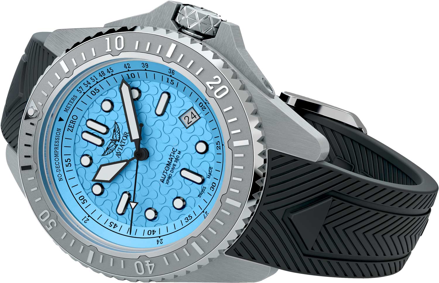 Циферблат с глубоким матовым покрытием и текстурой. Метки в виде точек и штрихов. На внутреннем кольце циферблата шкала бездекомпрессионного предела, что обеспечивает повышенную безопасность и точность. Окошко даты в положении 4 часа.