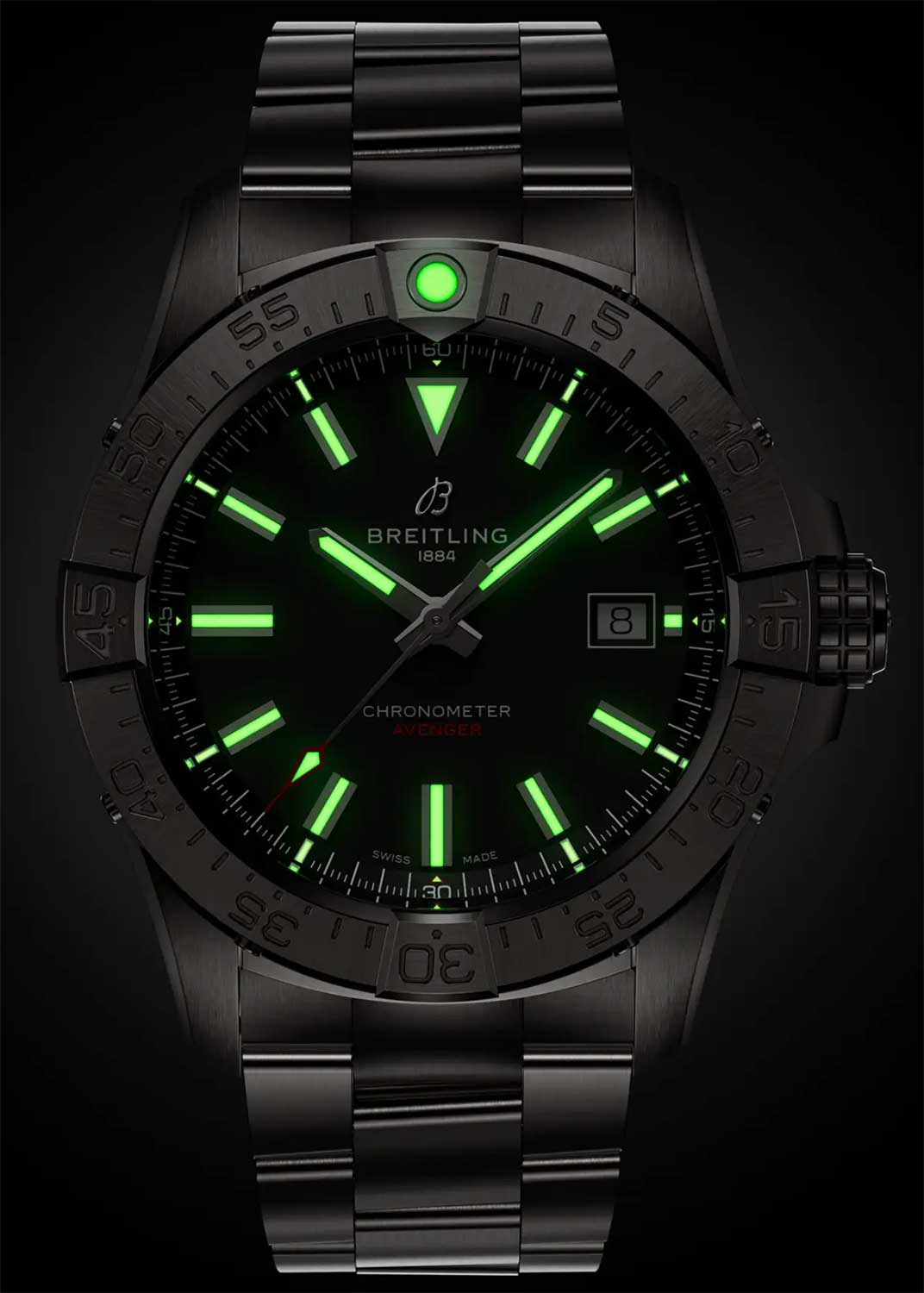 покрытием, которое светится в темноте после непродолжительной подзарядки на свету. Окошко даты находится в положении 3 часа.