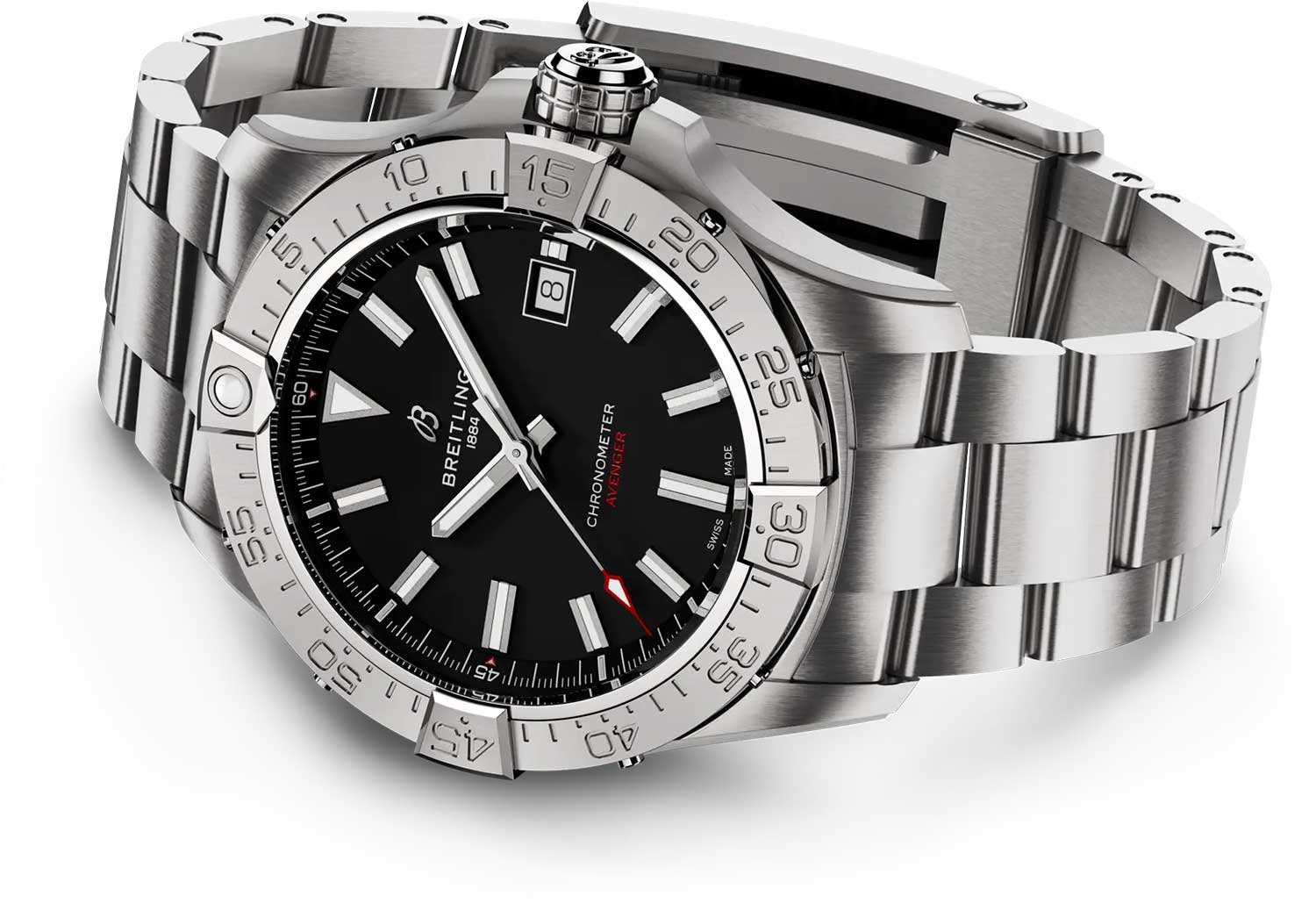 вращается в одном направлении. Завинчивающаяся заводная головка с защитой и двойной прокладкой. Завинчивающаяся задняя крышка. Браслет с раскладывающейся застежкой.