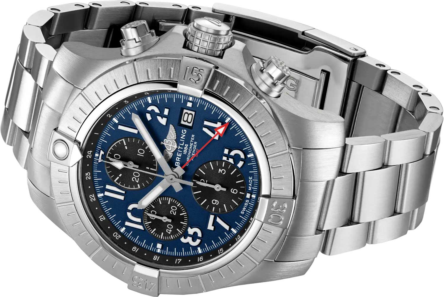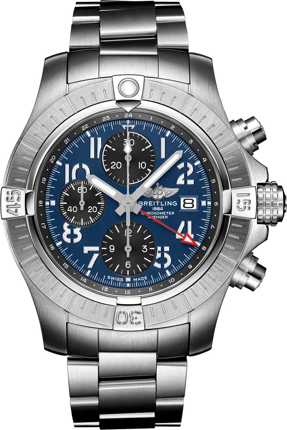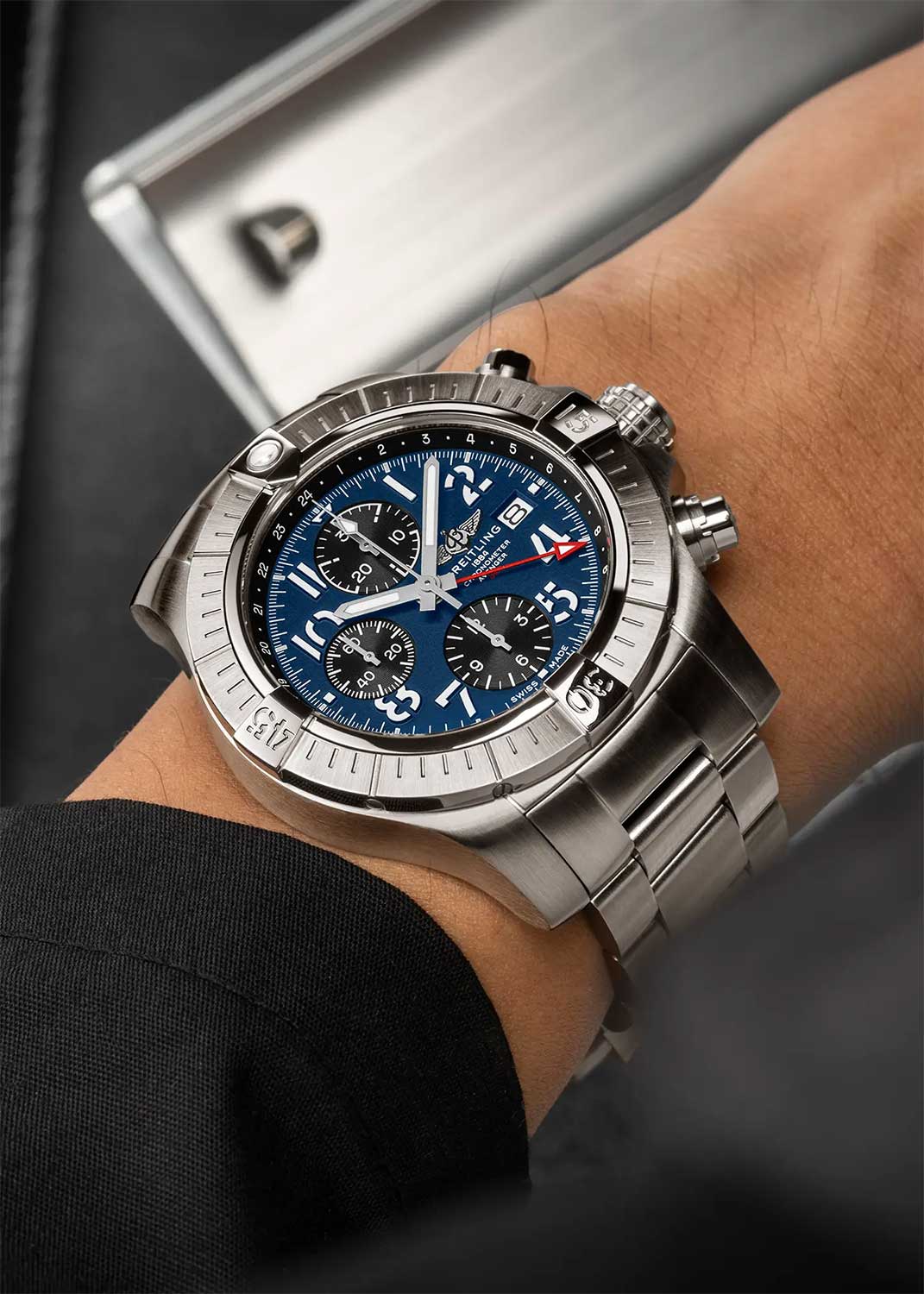 Avenger Chronograph GMT. В мануфактурном швейцарском механизме 25 камней,частота 28800 полуколебаний в час. Запас хода примерно 42 часа. Возможность ручного завода.Хронометр сертифицирован C.O.S.C.