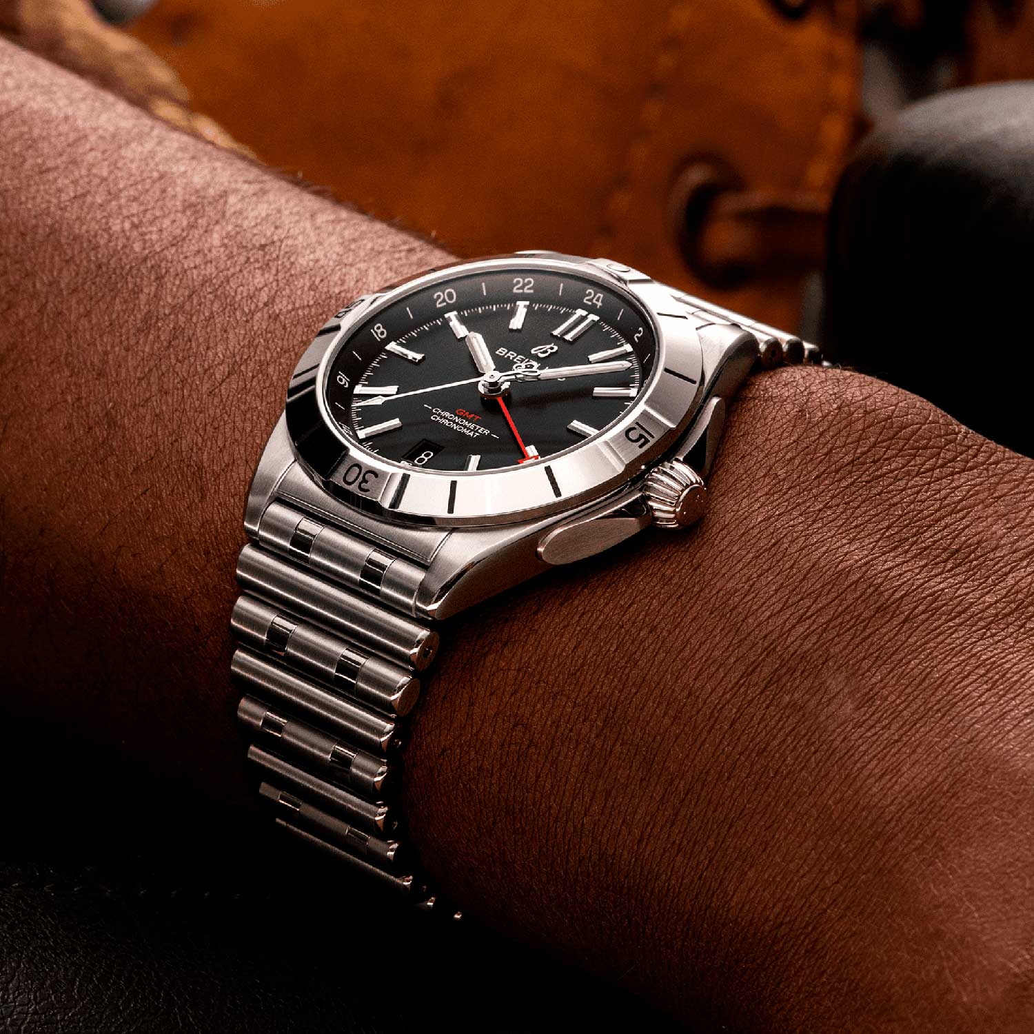 в 24-х часовом формате времени отображается дополнительной центральной стрелкой. Циферблат с метками в виде штрихов защищен прочным сапфировым стеклом. Антибликовое покрытие стекла позволит вам без труда узнать время даже в самый солнечный день. Окошко даты находится в положении 6 часов. Безель