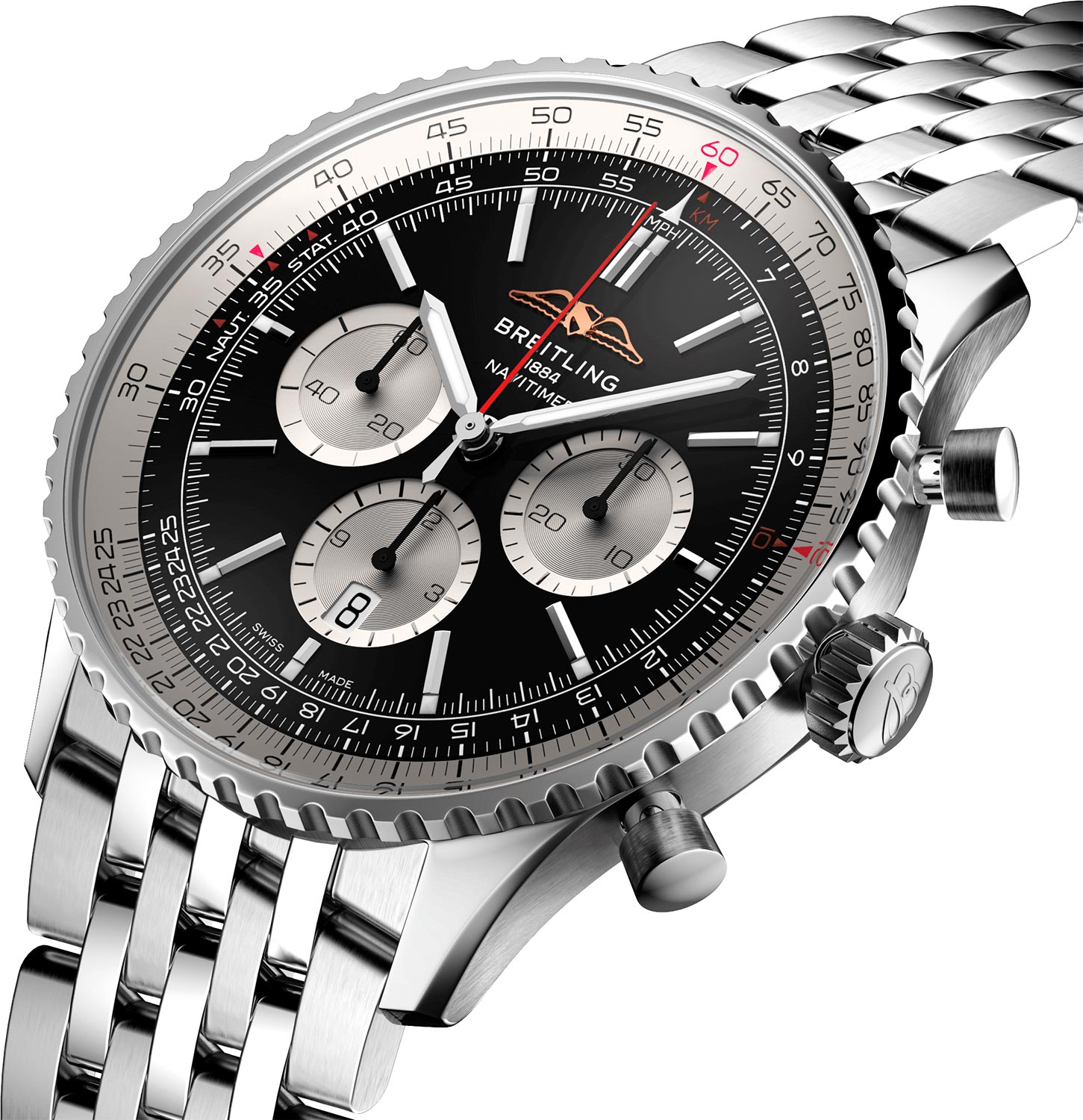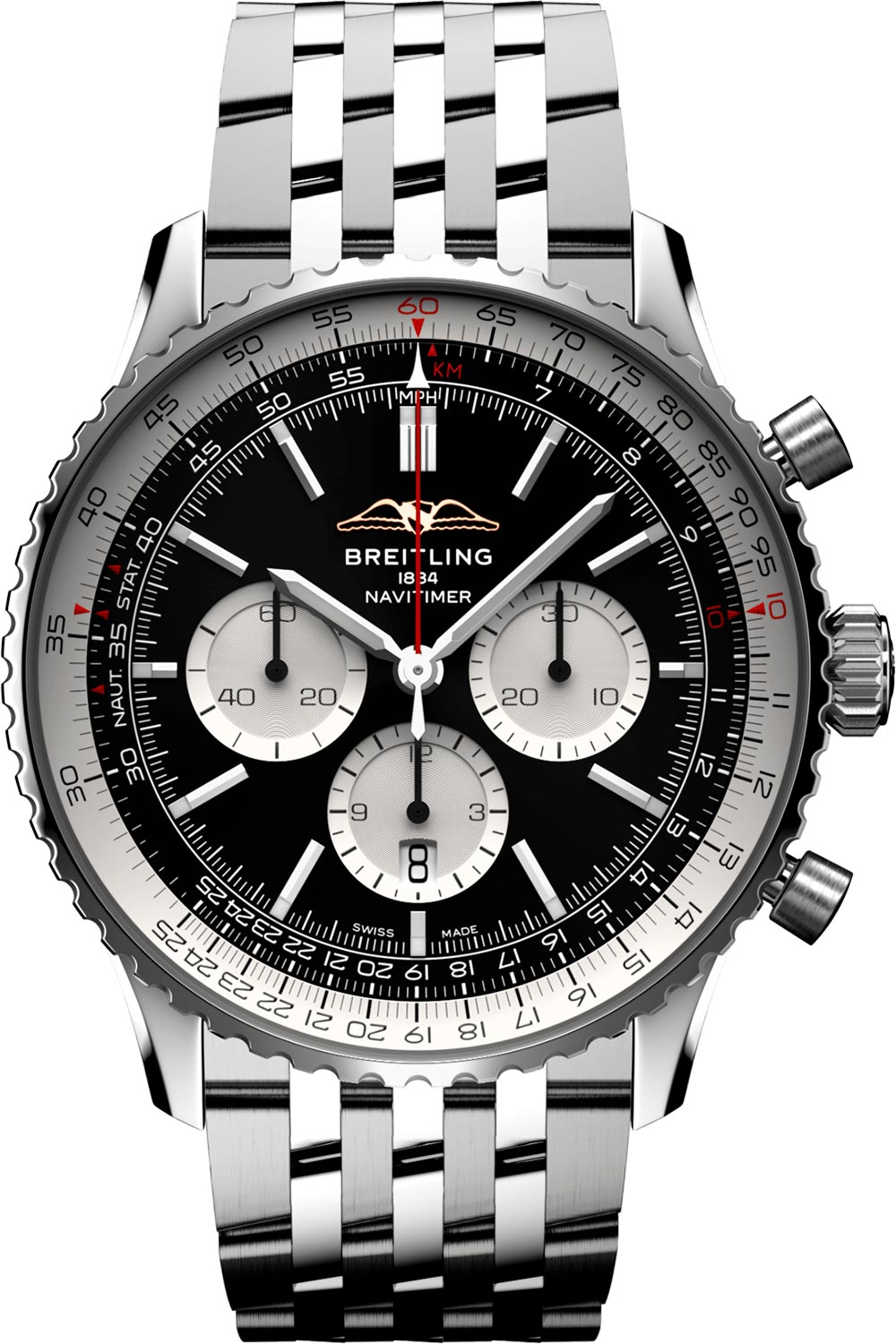 Легендарный авиатор от компании Breitling, точность и надежность которого прошла проверку временем.Navitimer B01. Название модели переводится как «навигационный таймер». В 1952 году Вилли Брейтлинг разработал наручный хронограф с круглой логарифмической линейкой, который использовали пилоты для полетных расчетов. В мануфактурном швейцарском механизме 47 камней,частота 28800 полуколебаний в час. Запас хода примерно 70 часов. Возможность ручного завода.Хронометр сертифицирован C.O.S.C.Часы-хронограф
