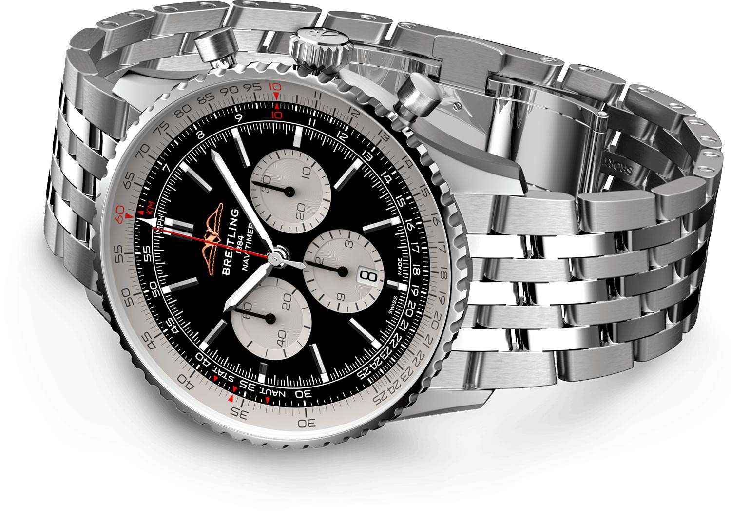 с секундомером. Секундомер с точностью 1/4с и временем измерения 12ч. Циферблат с метками в виде штрихов защищен прочным сапфировым стеклом. Окошко даты находится в положении 6 часов. Вращающийся безель с логарифмической линейкой. Заводная головка с двойным уплотнением. Завинчивающаяся прозрачная задняя крышка с сапфировым стеклом. Браслет с раскладывающейся застежкой.