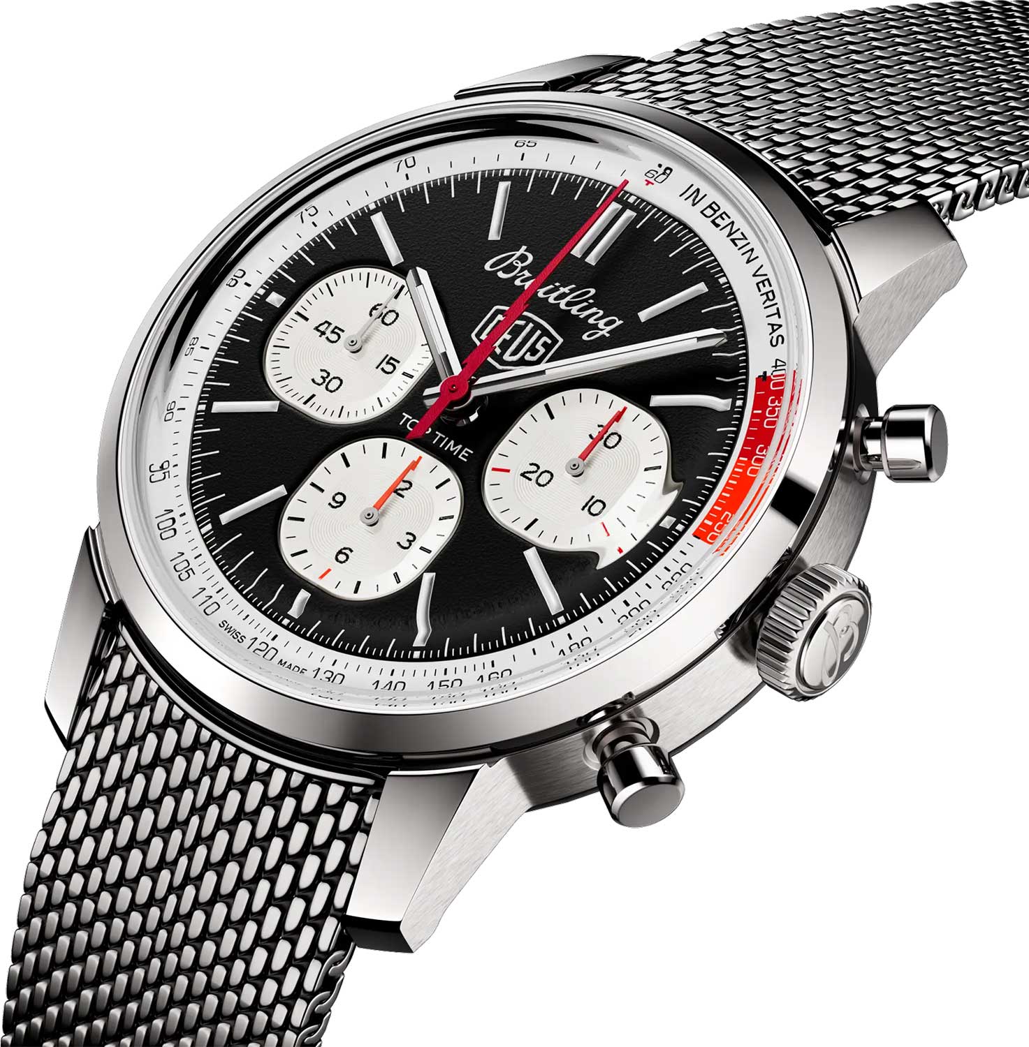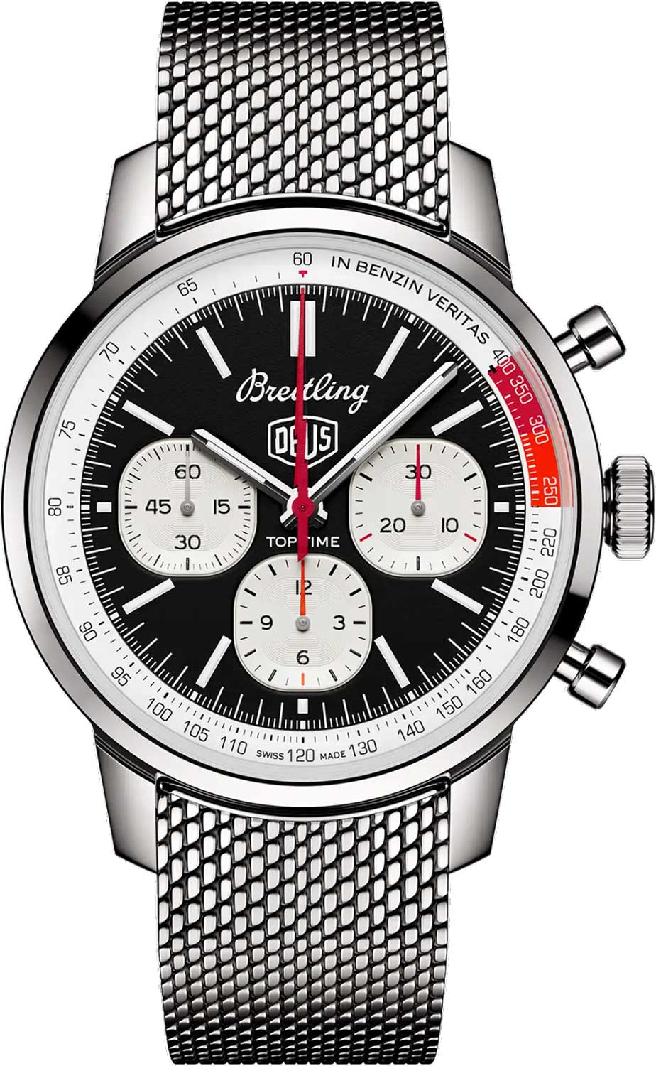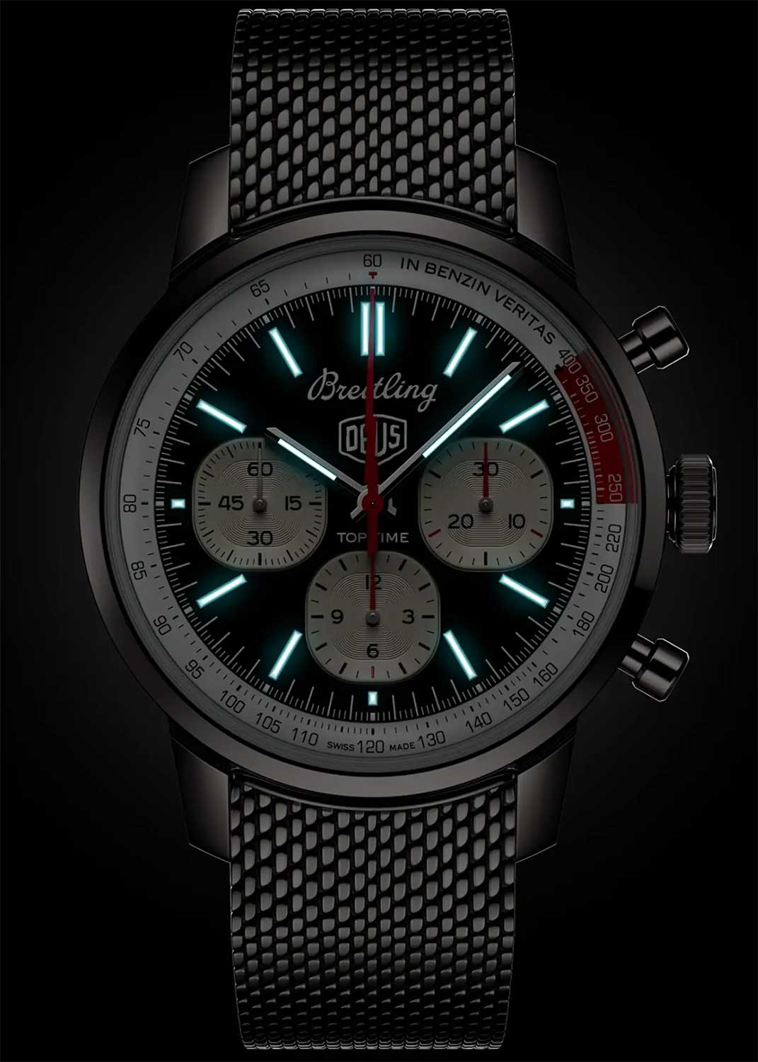 Top Time B01 Deus. Дизайн модели разработан совместно с австралийским производителем снаряжения для серфинга и мотоциклов Deus Ex Machina. Циферблат украшен эмблемой Deus и девиз компании «In benzin veritas» (В бензине истина). Циферблаты хронографа выполнены в форме старинных указателей приборной панели.