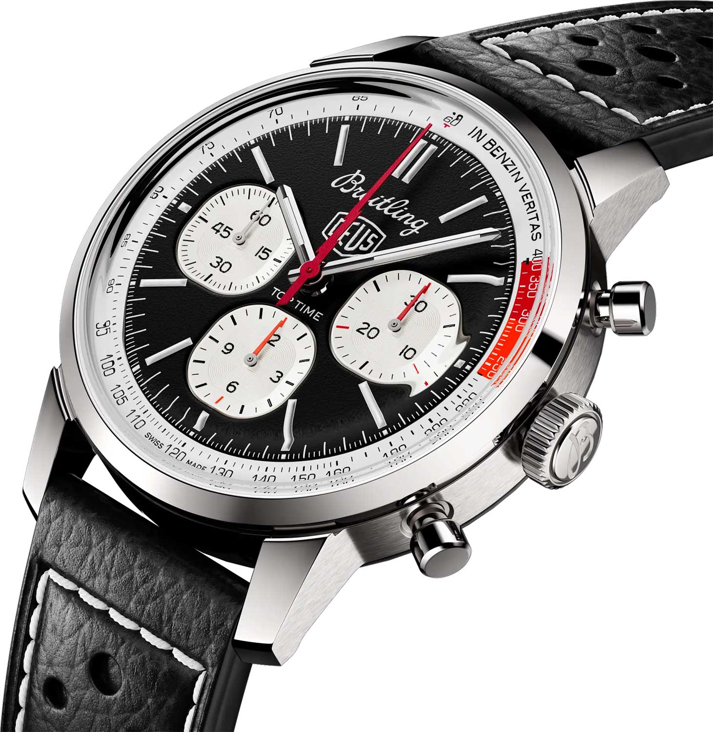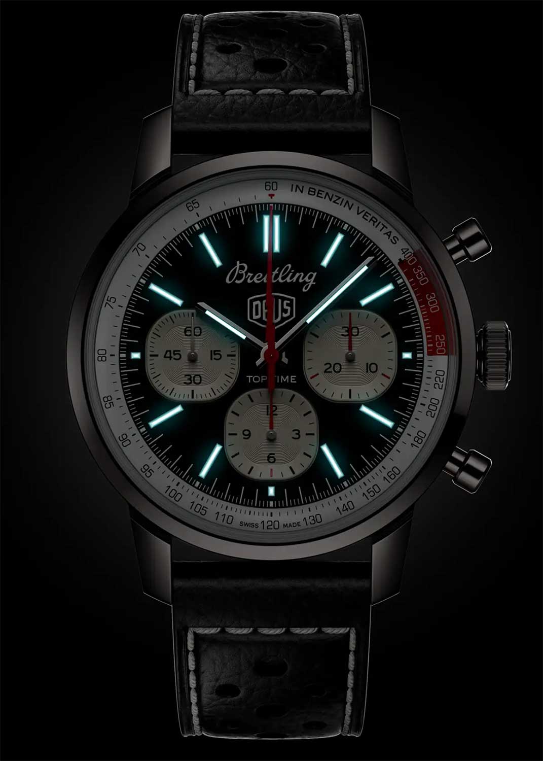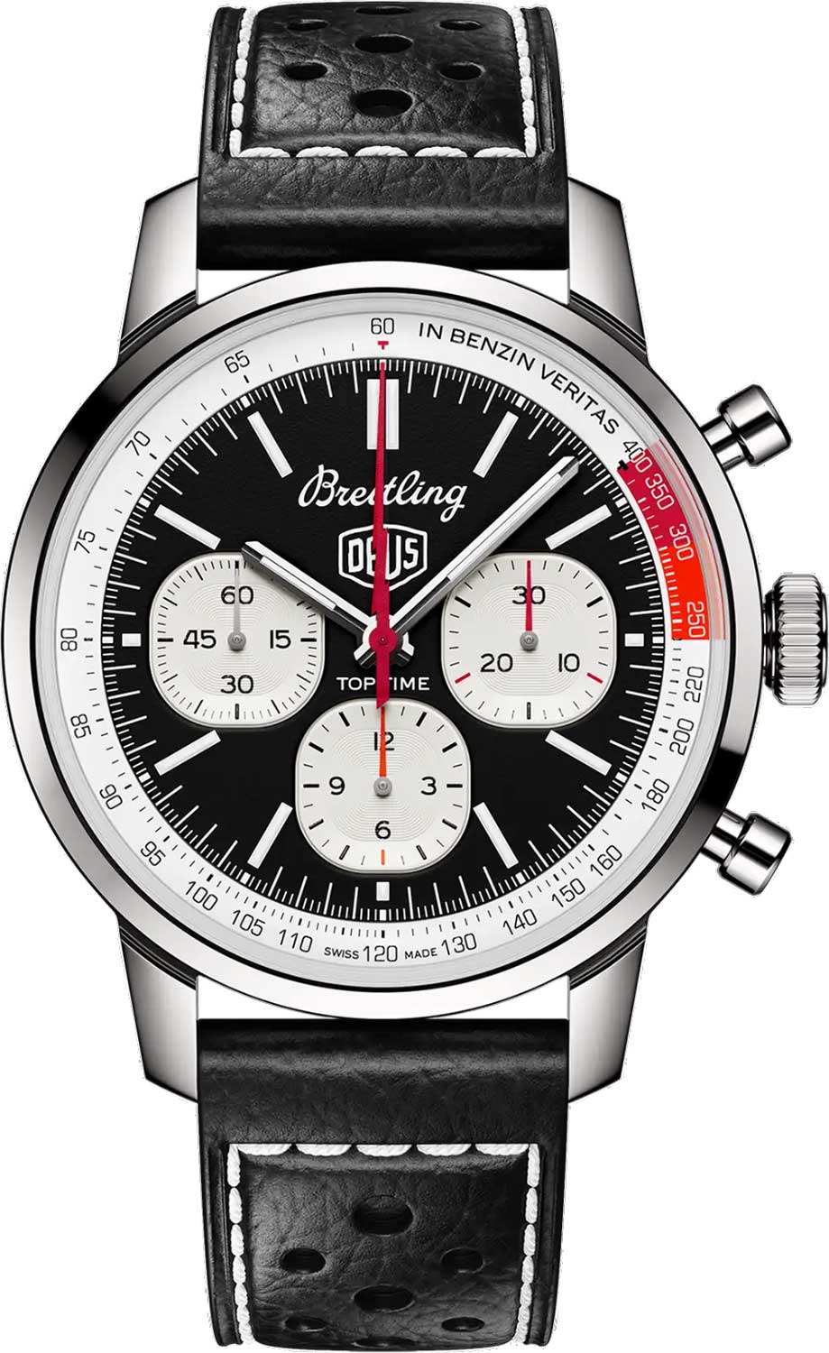Top Time B01 Deus. Дизайн модели разработан совместно с австралийским производителем снаряжения для серфинга и мотоциклов Deus Ex Machina. Циферблат украшен эмблемой Deus и девиз компании «In benzin veritas» (В бензине истина). Циферблаты хронографа выполнены в форме старинных указателей приборной панели.