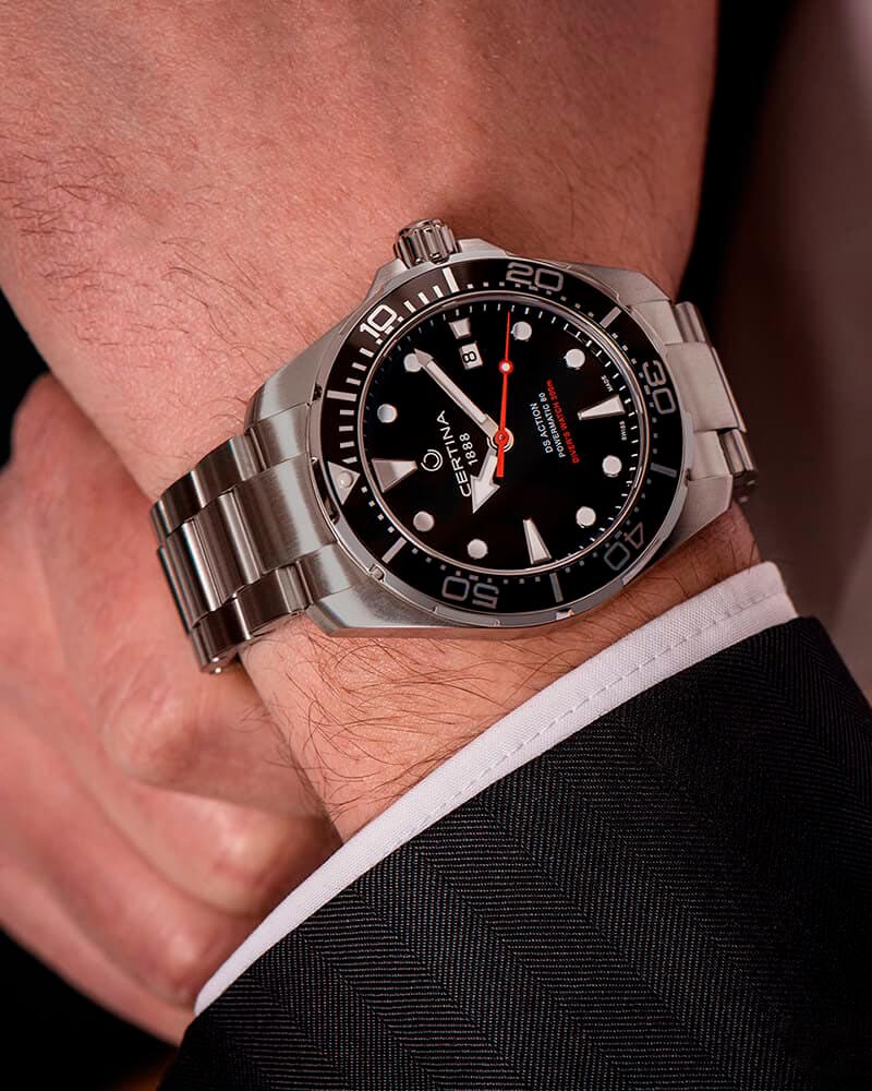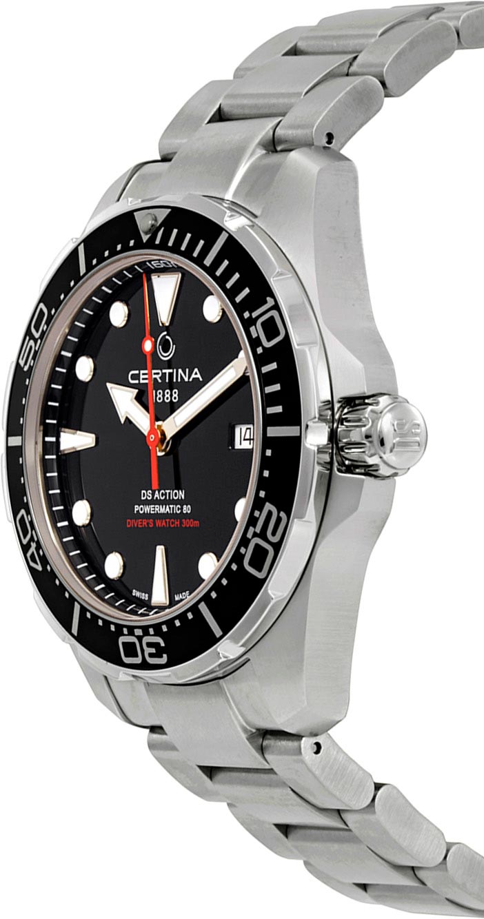 Спортивный дух этих практичных часов многие оценят по достоинству. Эффектный облик, практичное содержание. Автоматические оригинальные наручные часы DS Action Diver Powermatic 80. Круглый стальной корпус. Вращающийся безель. Циферблат выполнен по технологии Sunray (солнечные лучи). Мечевидные стрелки в стиле Sword. Накладные метки в виде точек и штрихов. Метки и стрелки с люминесцентным покрытием, которое светится в темноте после непродолжительной зарядки на свету. Окошко даты находится в положении 3 часа. Рифленая заводная головка с защитой. Надежный стальной браслет с раскладывающейся застежкой.