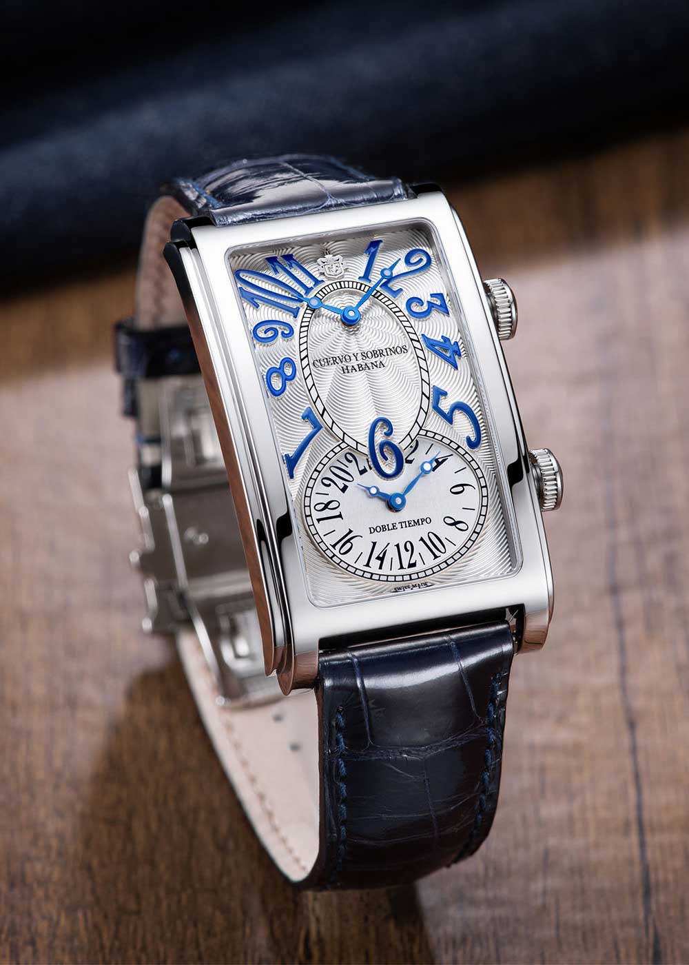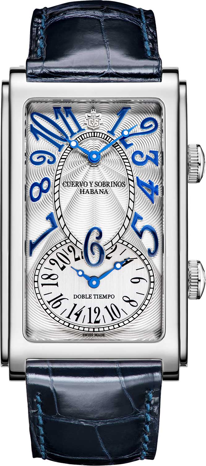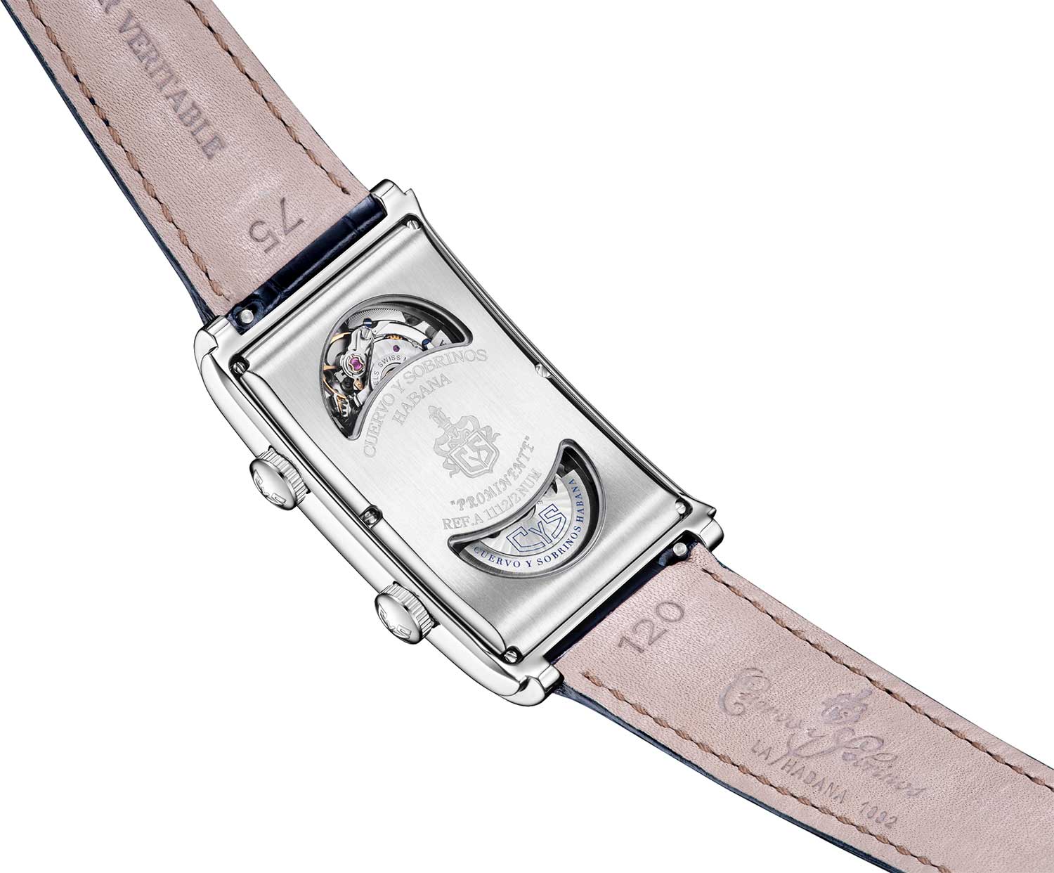 Прозрачная задняя крышка крепится на 6-ти винтах. Ремешок из крокодиловой кожи с раскладывающейся застежкой, украшенной эмблемой бренда «CyS». Система быстрой замены ремешка. В подарок фирменный хьюмидор — традиционный кубинский футляр для сигар из дорогих пород дерева.