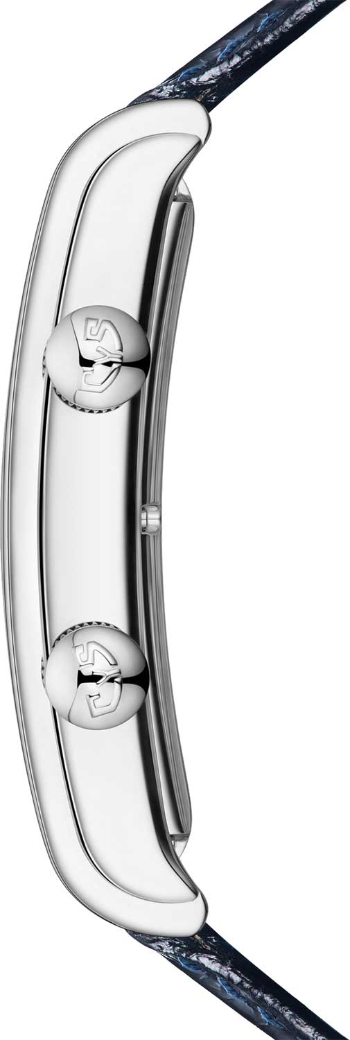 Прямоугольный эргономичный корпус из полированной стали. Гильошированный циферблат защищен прочным сапфировым стеклом. Метки в виде арабских цифр. Стрелки с люминесцентным покрытием выполнены в стиле Breguet.