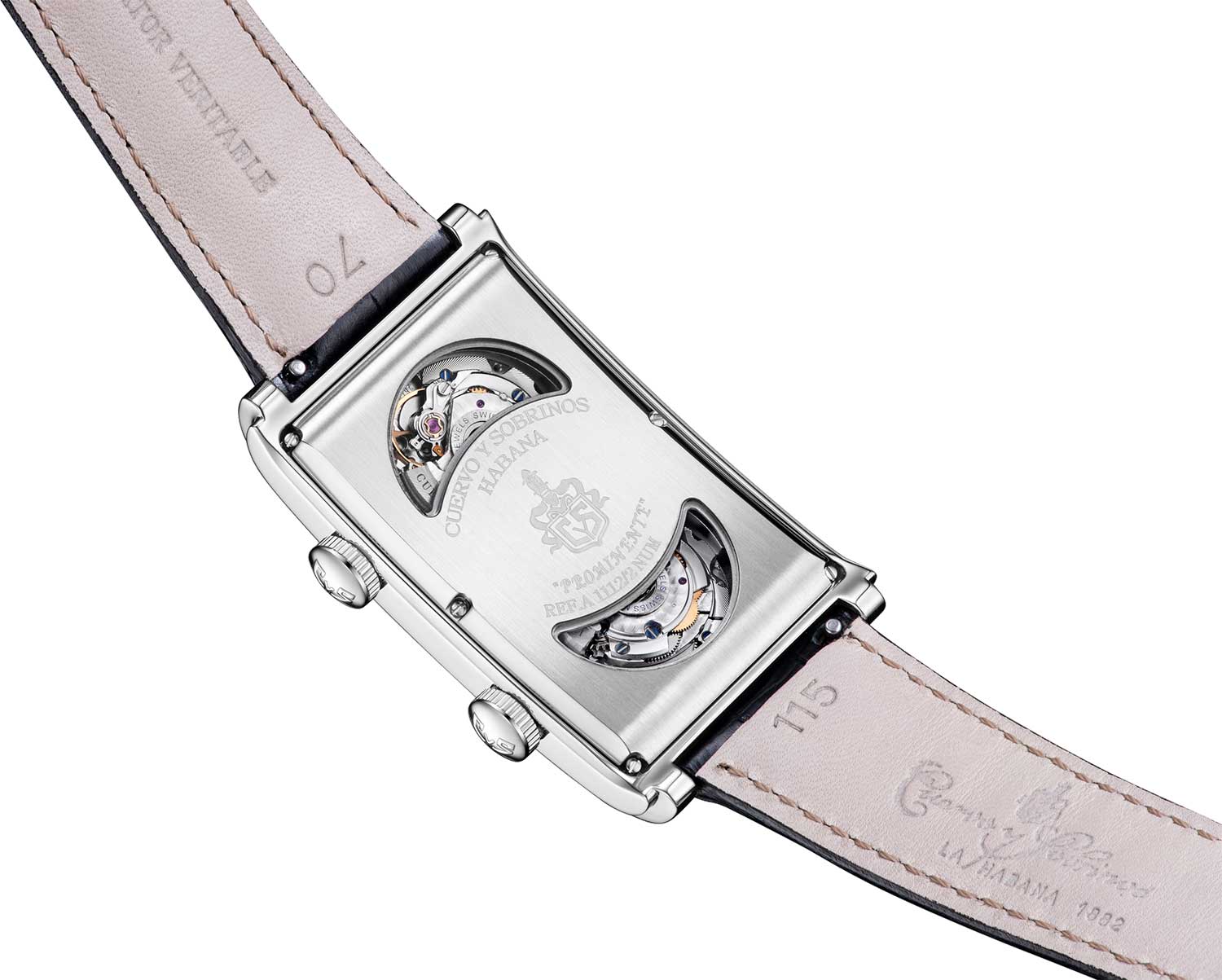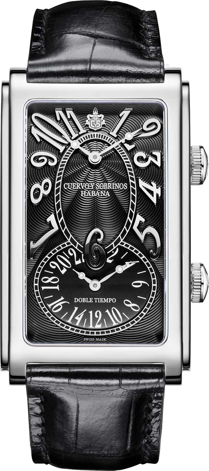 Прозрачная задняя крышка крепится на 6-ти винтах. Ремешок из крокодиловой кожи с раскладывающейся застежкой, украшенной эмблемой бренда «CyS». Система быстрой замены ремешка. В подарок фирменный хьюмидор — традиционный кубинский футляр для сигар из дорогих пород дерева.