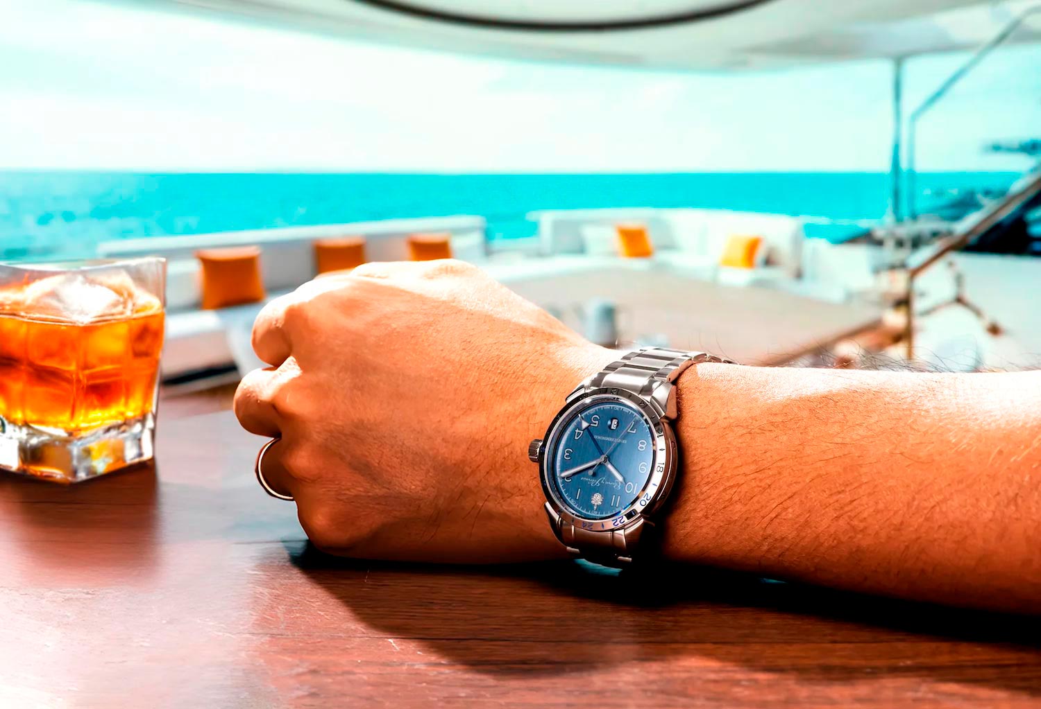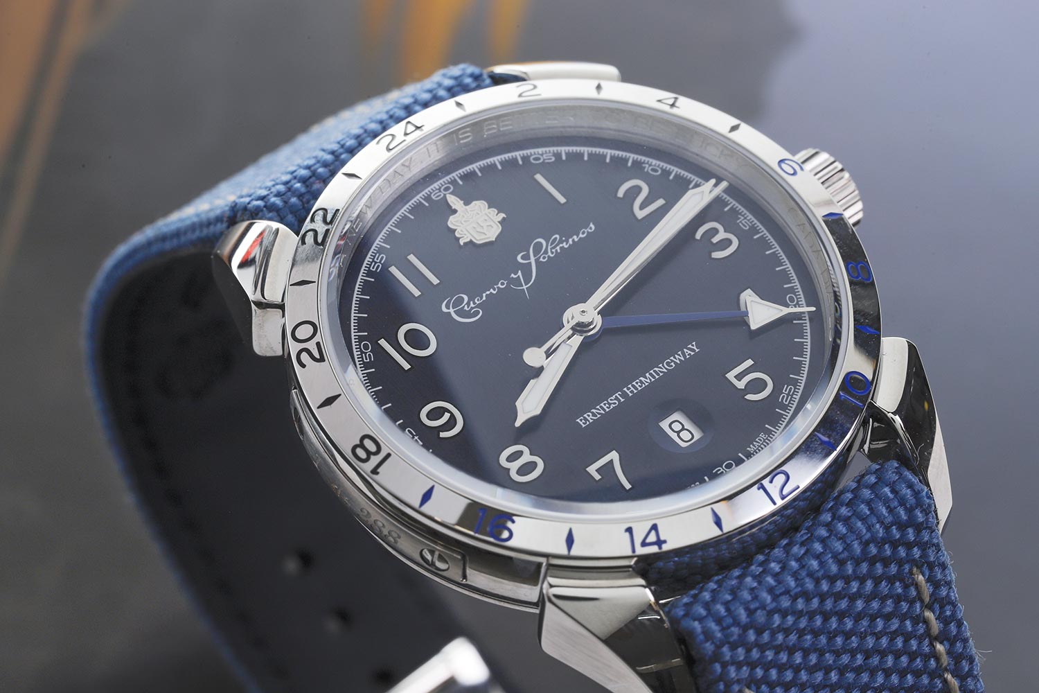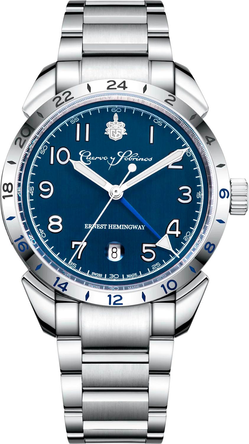 Стильная классика вобрала все самое лучшее от современного стиля, а второй часовой пояс отлично дополнит необходимый функционал. Время путешествовать.Винтажные эксклюзивные часы Hemingway GMT ''The Fisherman''. Модель посвящена памяти американского писателя Эрнеста Хемингуэя. Под патронажем Джона Хемингуэя, внука писателя, часы были представлены в Ки-Уэсте, штат Флорида, ко Дням памяти Хемингуэя 2023 года. Лимитированная серия - 288 экземпляров. В механизме 25 камней,частота 28800 полуколебаний в час. Запас хода 42 часа. Круглый эргономичный корпус из полированной стали. Матовый циферблат. Накладные метки в виде арабских цифр. Метки и стрелки с люминесцентным покрытием SuperLuminova, которое светится в темноте после непродолжительной зарядки на свету. Окошко даты находится в положении 6 часов. Второй часовой пояс отображается центральной стрелкой, которая заканчивается формой рыбьего хвоста Marlin. Внутренний безель часов украшен гравировкой цитат писателя ''Чтобы писать о жизни, сначала нужно ее прожить'' на английском (в положении 12 часов) и испанском (в положении 6 часов). Задняя крышка с сапфировым стеклом, на роторе