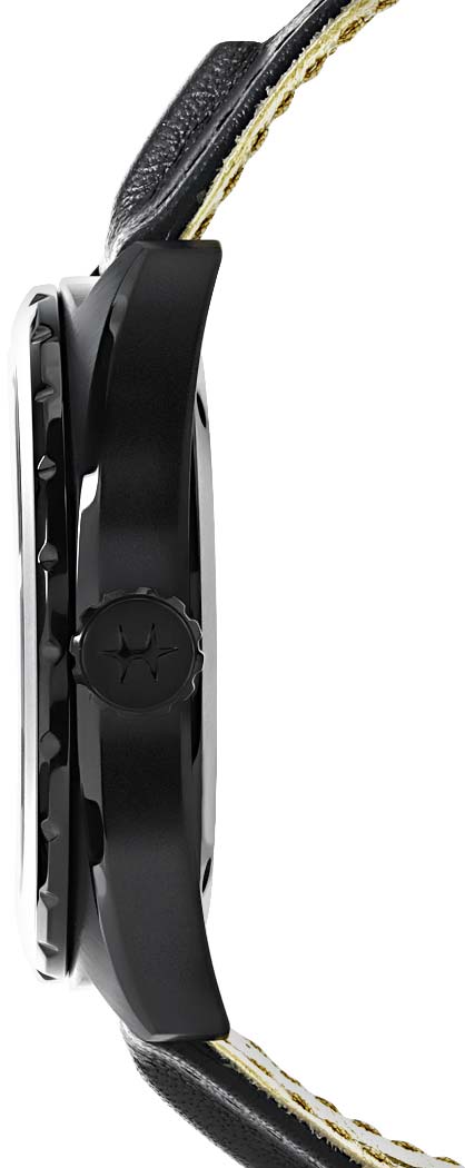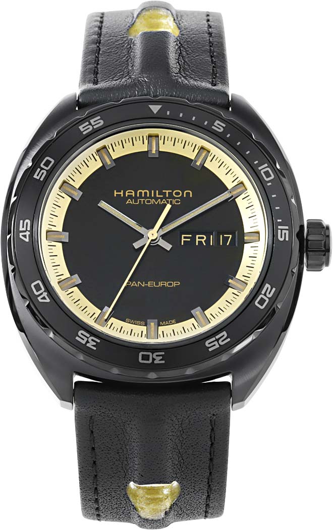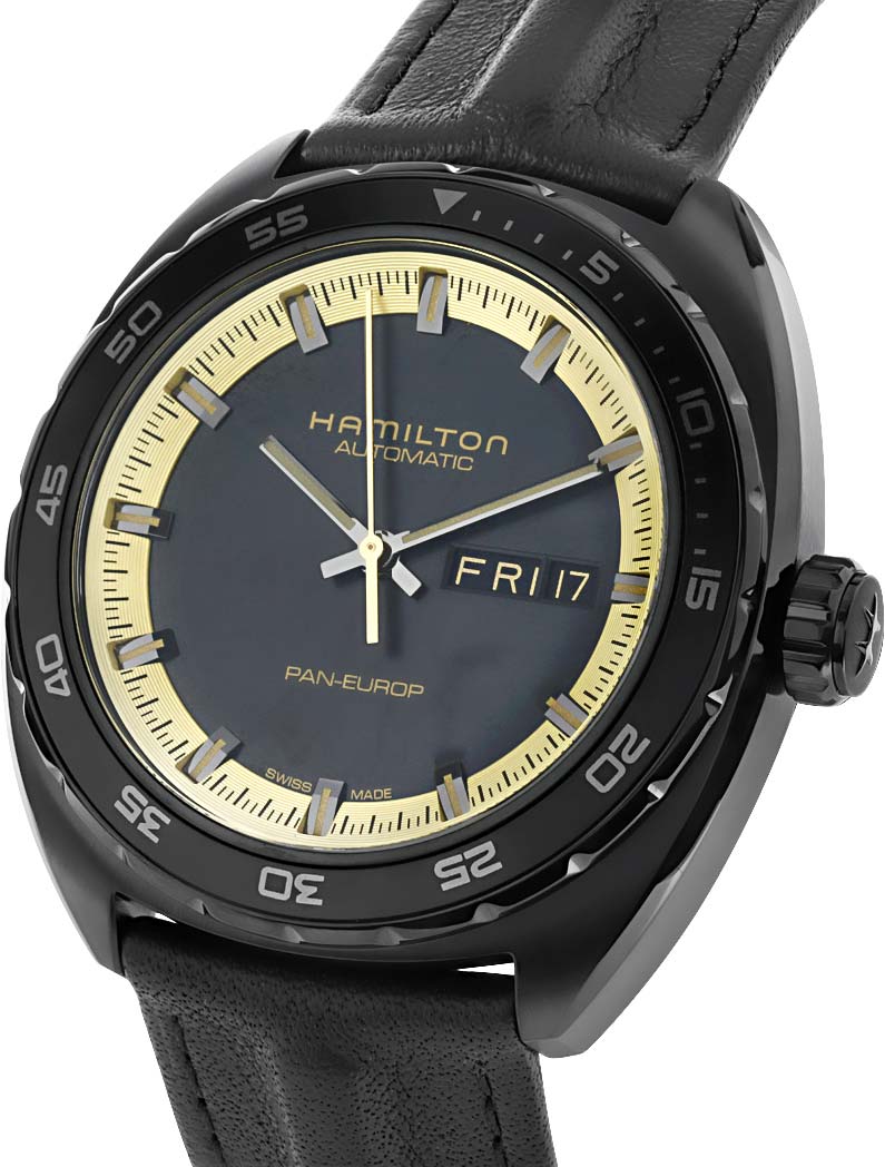 Аксессуар из серии в черных и золотых тонах, воплощающей загадочный и роскошный Голливуд. Мужские часы Pan Europ Day Date Auto. Круглый стальной корпус. Эксклюзивный калибр H-30. Запас хода 80 часов. Метки в виде штрихов. Окошко даты находится в положении 3 часа. Прозрачная задняя крышка. Кожаный ремешок с раскладывающейся застежкой.