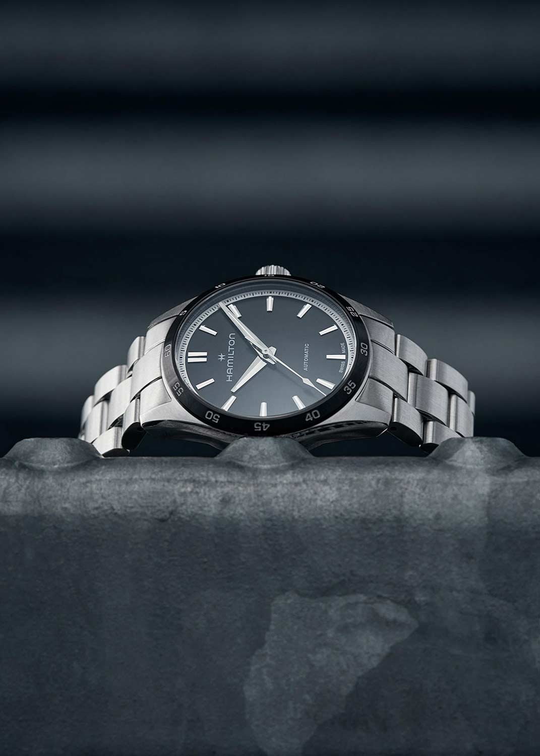 Циферблат выполнен по технологии Sunray (солнечные лучи) и украшен логотипом бренда. Метки в виде штрихов. Завинчивающаяся рифленая заводная головка. Завинчивающаяся прозрачная задняя крышка. Браслет с раскладывающейся застежкой.