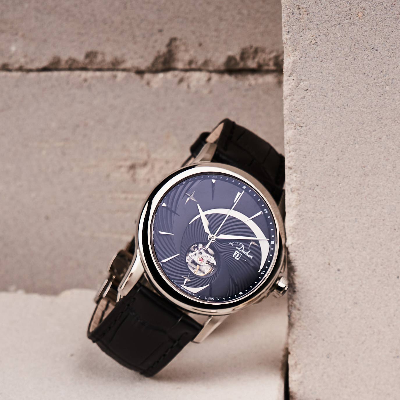 Круглый корпус, доступный взору механизм и строгий дизайн подчеркивают сдержанный характер часов. Supernova. Сквозь прозрачное окошко на циферблате можно наблюдать за работой механизма часов. Ремешок с раскладывающейся застежкой.