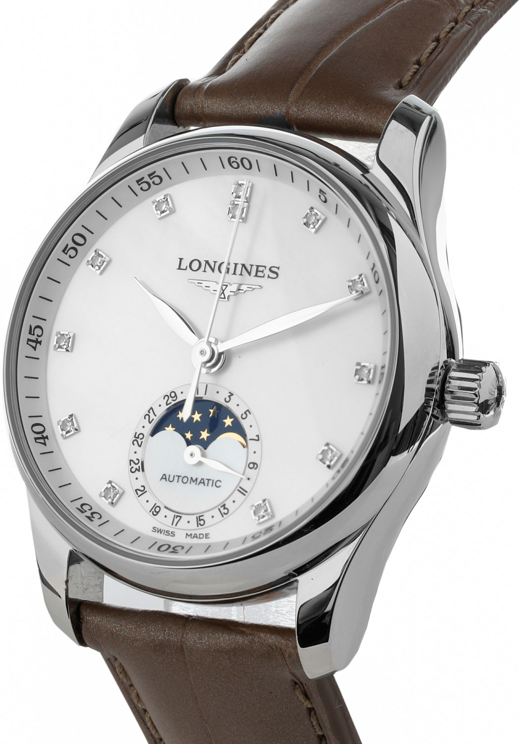 Нежные переливы перламутра идеально дополняют обворожительные бриллианты. Часы для настоящей леди! Часы с круглым стальным корпусом. Эксклюзивный механизм Longines с частотой 25200 полуколебаний в час. Запас хода примерно 72 часа. Перламутровый циферблат защищен прочным сапфировым стеклом. Метки в виде точек, инкрустированных бриллиантами. Индикатор даты и фаз Луны находится в положении 6 часов. Рифленая заводная головка. Прозрачная задняя крышка с сапфировым стеклом. Ремешок с тройной раскладывающейся застежкой. Застежка с системой блокировки. Внешний вид упаковки может отличаться от представленной на фото. Уточняйте при заказе.