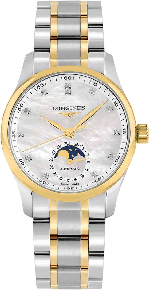 Женские наручные часы. Эксклюзивный механизм Longines с частотой 25200 полуколебаний в час. Запас хода примерно 72 часа. Круглый стальной корпус. Перламутровый циферблат защищен прочным сапфировым стеклом. Метки в виде точек, инкрустированных бриллиантами.