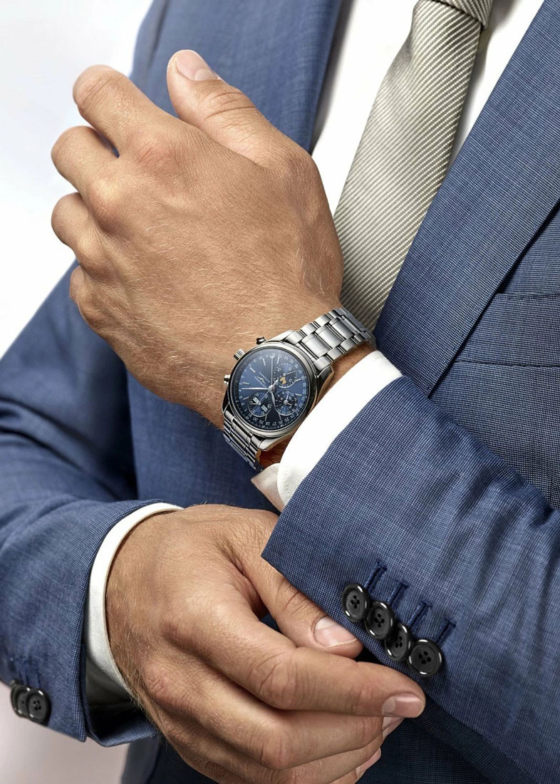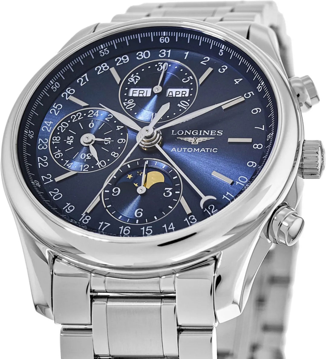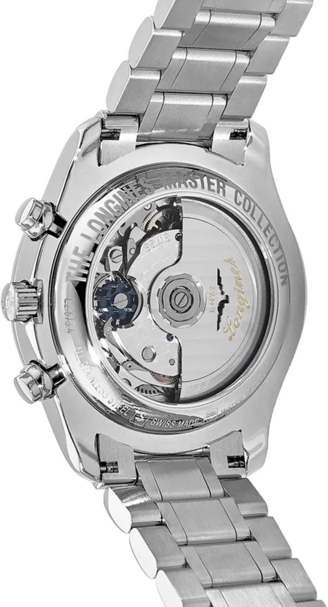 Мужские часы-хронограф с секундомером Master Collection Moonphase. Круглый стальной корпус. Эксклюзивный механизм Longines с частотой 28800 полуколебаний в час. Запас хода примерно 66 часов.