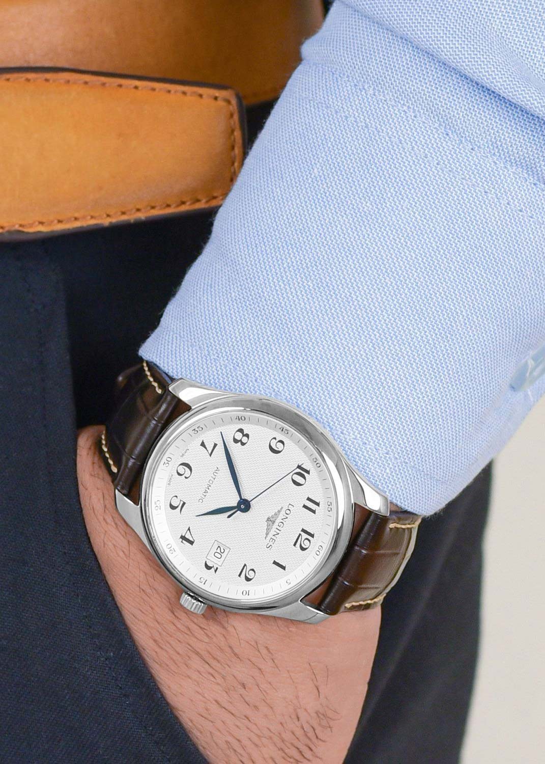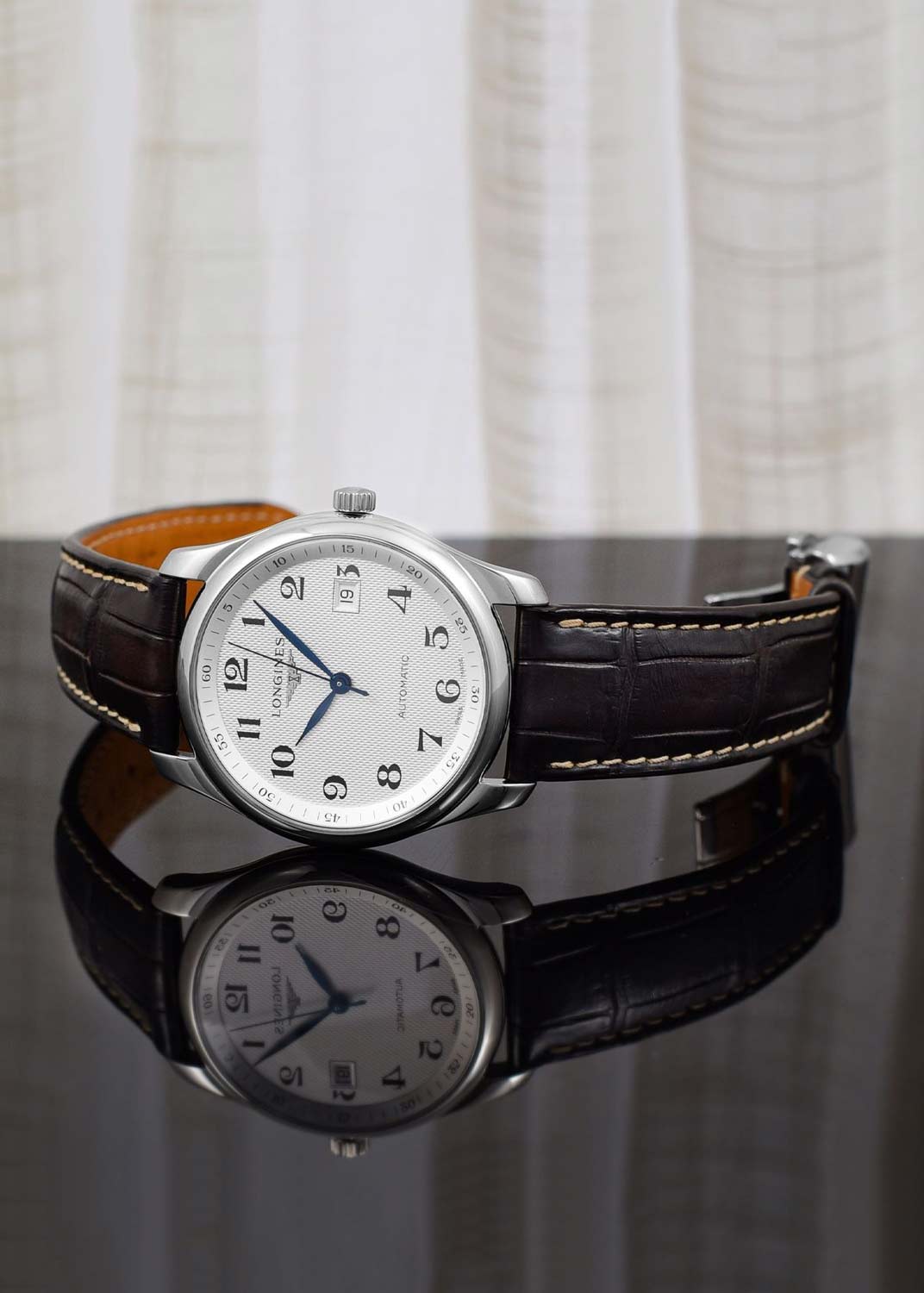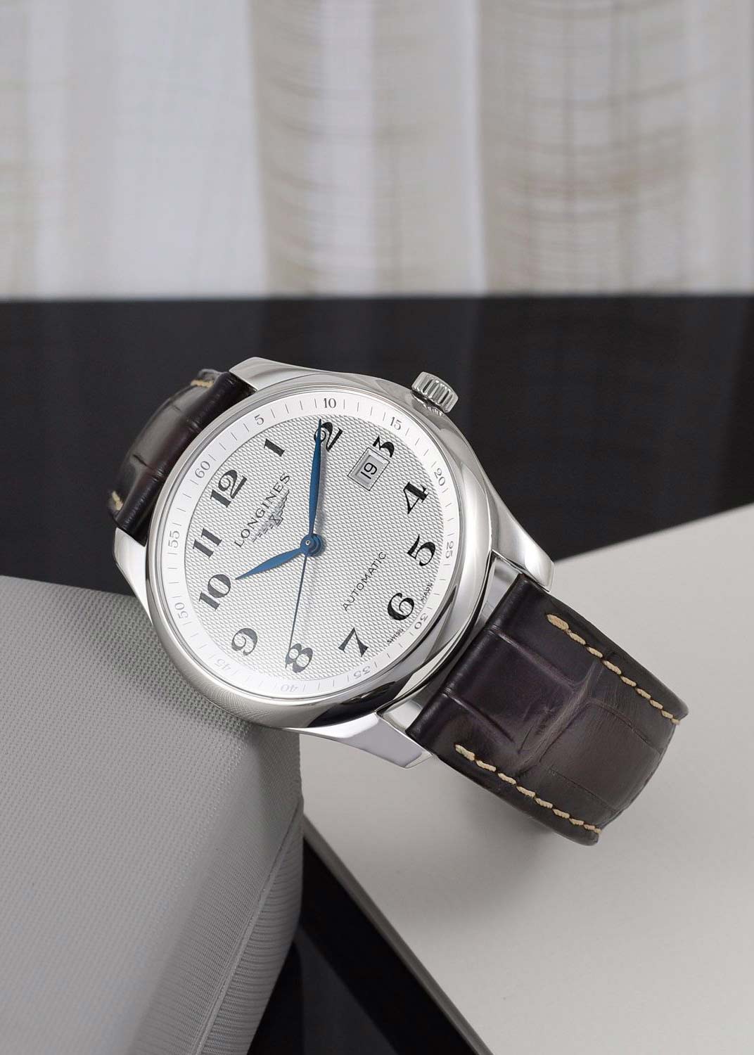 Мужские наручные часы. Эксклюзивный механизм Longines с частотой 25200 полуколебаний в час. Запас хода примерно 72 часа. Круглый стальной корпус. Циферблат украшен узором Barleycorn и защищен прочным сапфировым стеклом. Нарисованные метки в виде арабских цифр.