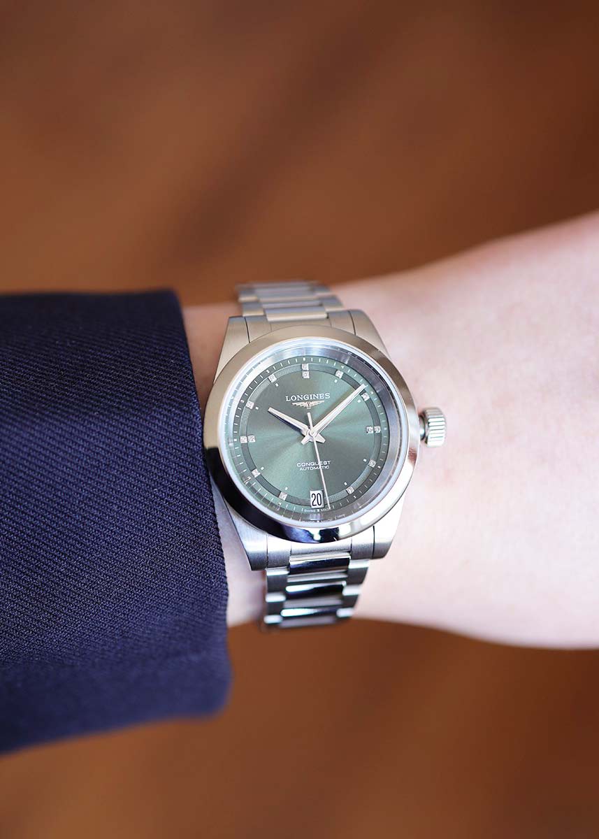 Женские наручные часы. Эксклюзивный механизм Longines с частотой 28800 полуколебаний в час. Запас хода примерно 45 часов. Защищены от магнитных полей. Круглый стальной корпус. Циферблат выполнен по технологии Sunray (солнечные лучи) и защищен прочным сапфировым стеклом. Метки в виде точек и штрихов, инкрустированных бриллиантами.