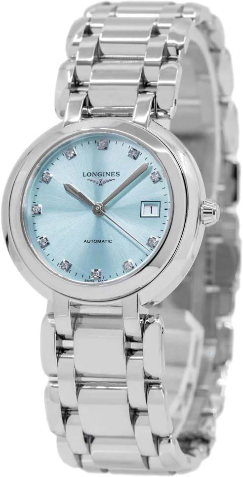 Женские наручные часы. Эксклюзивный механизм Longines с частотой 28800 полуколебаний в час. Запас хода примерно 45 часов. Круглый стальной корпус. Циферблат выполнен по технологии Sunray (солнечные лучи) и защищен прочным сапфировым стеклом. Метки в виде точек, инкрустированных бриллиантами.