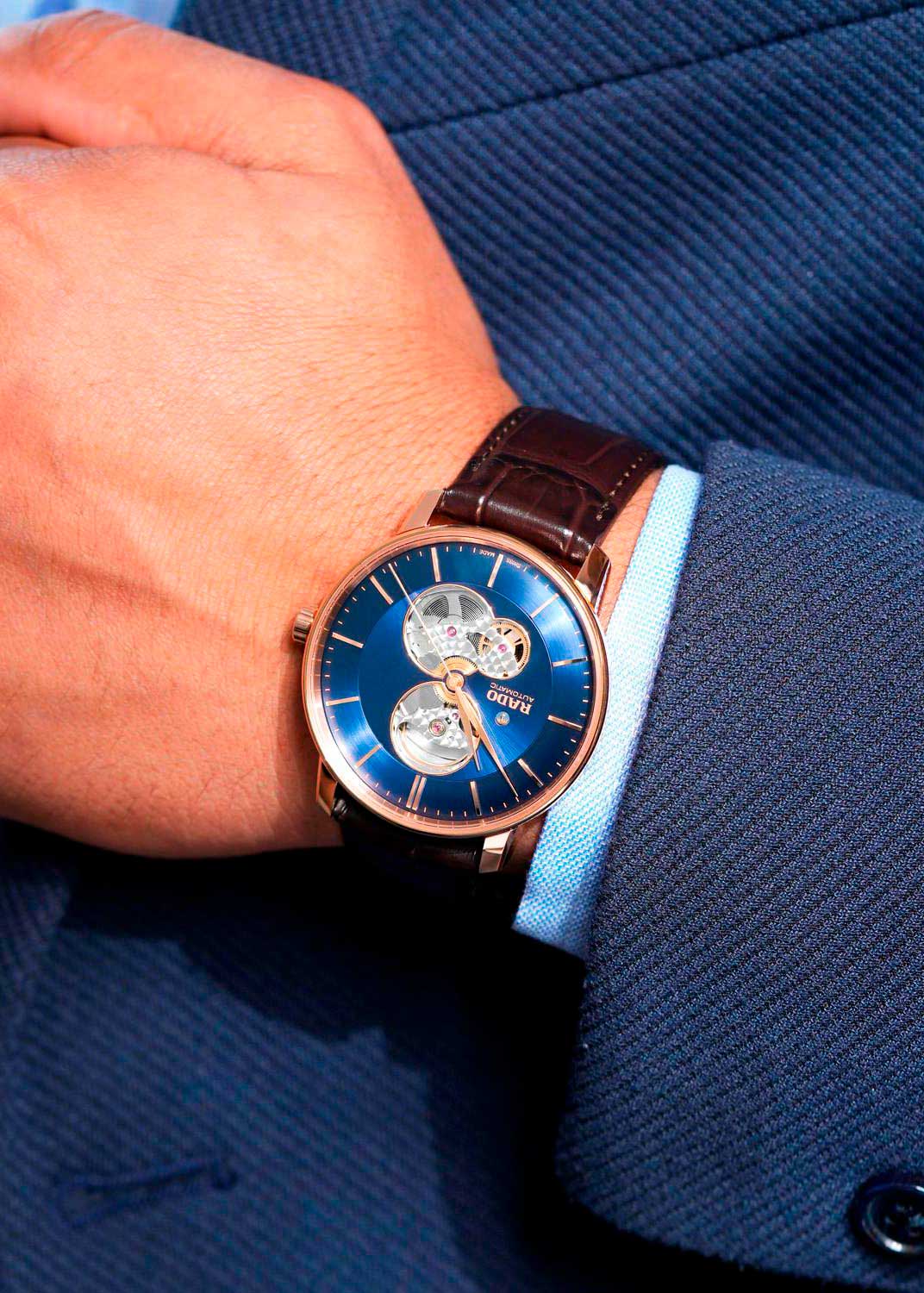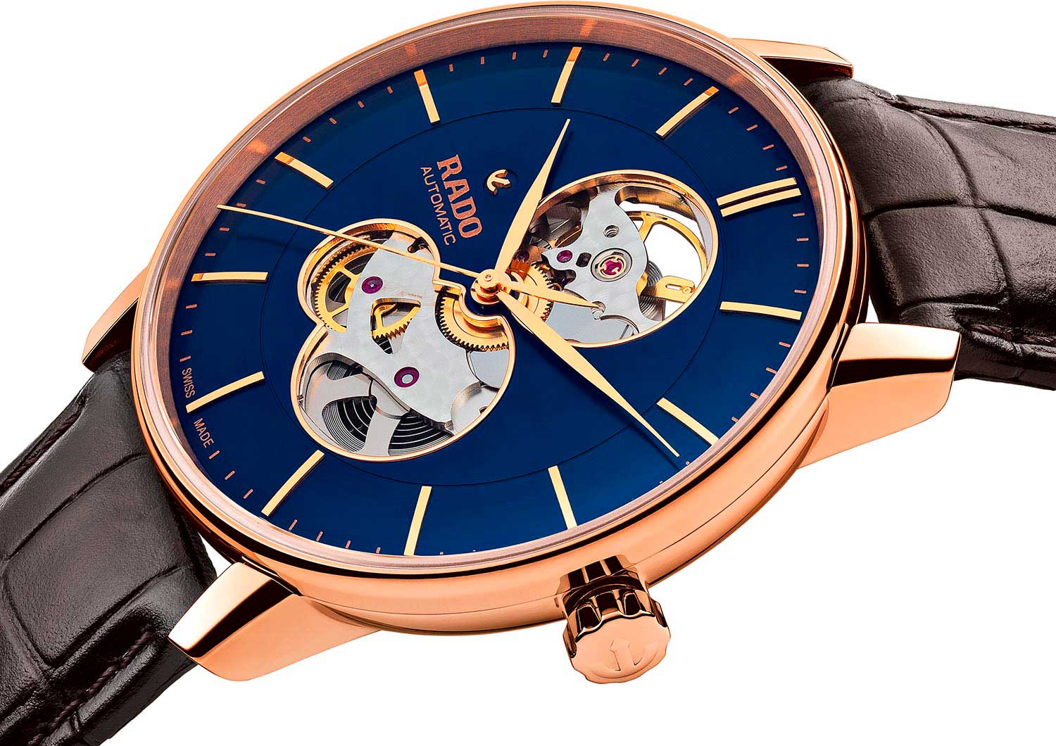 Сквозь прозрачное окошко на циферблате можно наблюдать за работой механизма часов. Накладные метки в виде штрихов. Листовидные стрелки в стиле Feuille. Прозрачная задняя крышка. Рифленая заводная головка. Удобный кожаный ремешок с раскладывающейся застежкой.