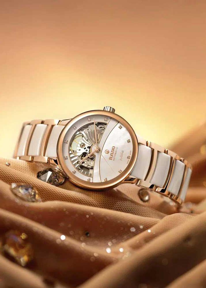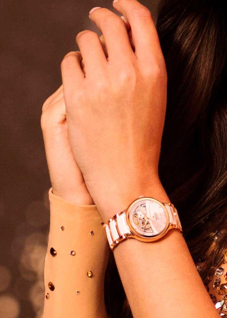 Сквозь прозрачное окошко на циферблате можно наблюдать за работой механизма часов. Листовидные стрелки в стиле Feuille. Рифленая заводная головка. Прозрачная задняя крышка. Надежный стальной браслет с вставками из керамики. Раскладывающаяся застежка.