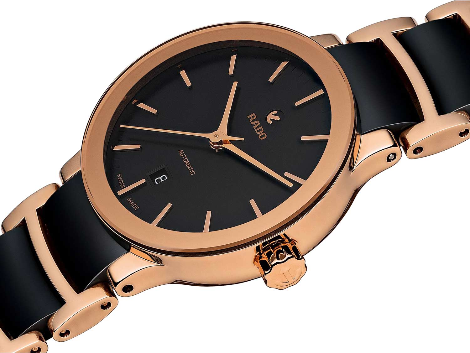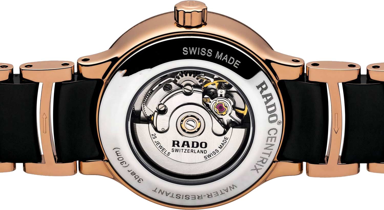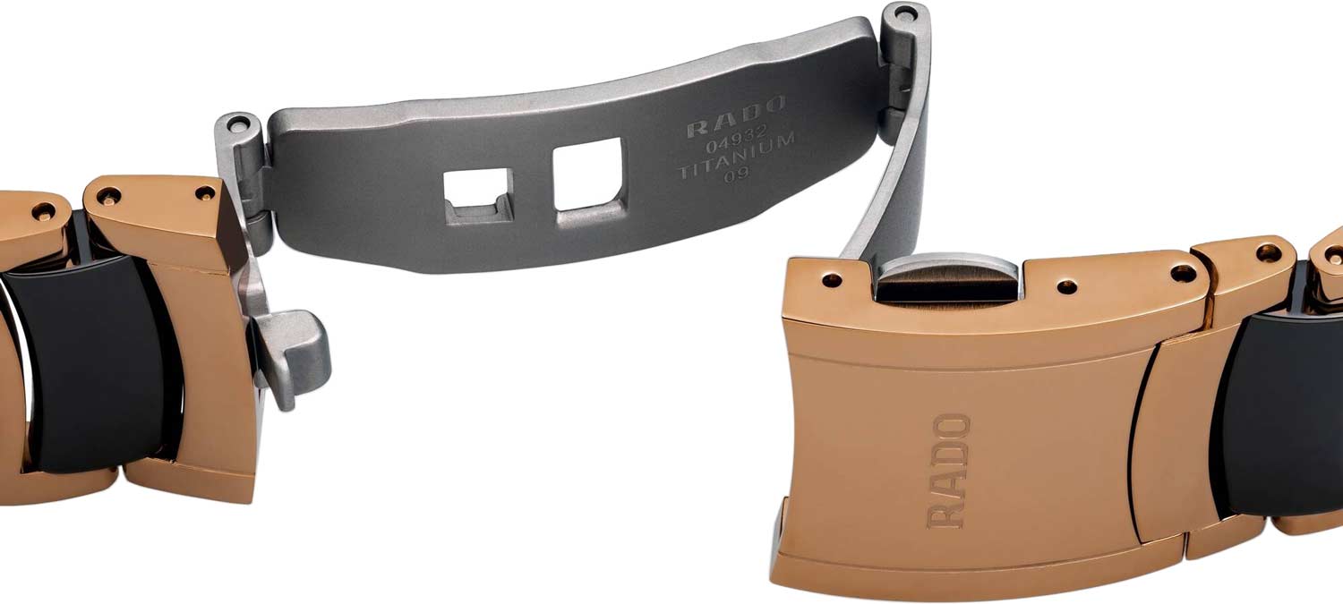 Рифленая заводная головка. Прозрачная задняя крышка. Надежный стальной браслет со вставками из черной керамики. Раскладывающаяся застежка.