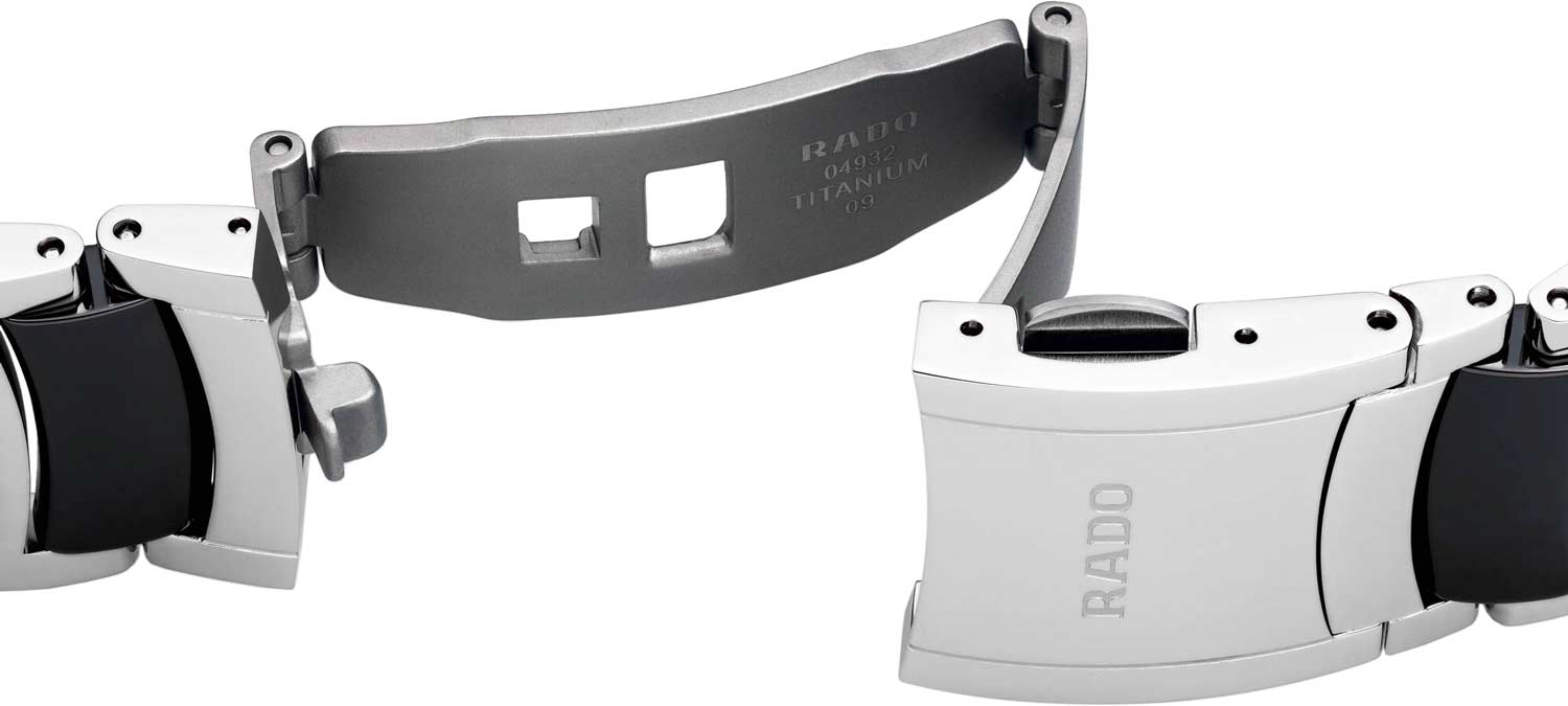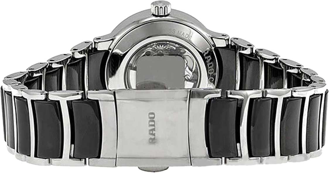 Рифленая заводная головка. Прозрачная задняя крышка. Надежный стальной браслет со вставками из черной керамики. Раскладывающаяся застежка.