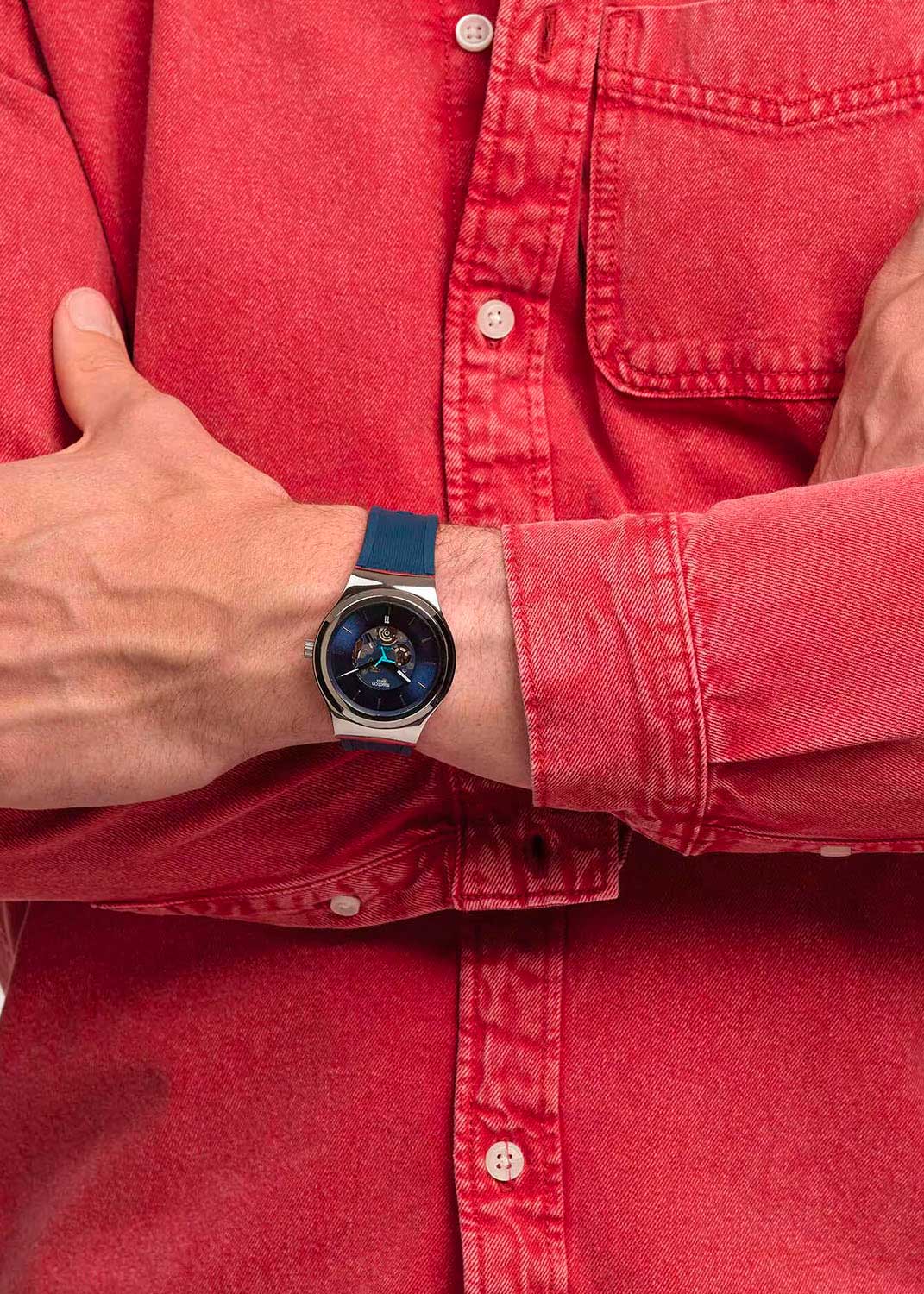 Трехкрылая секундная стрелка в ярком сине-бирюзовом цвете. Окошко даты находится в положении 6 часов. Стекло из многослойного акрила. Рифленая заводная головка. Прозрачная задняя крышка. Силиконовый ремешок с классической стальной застежкой.