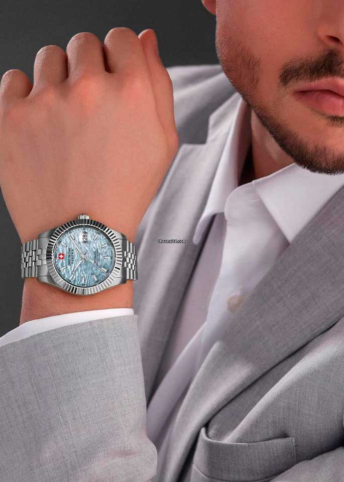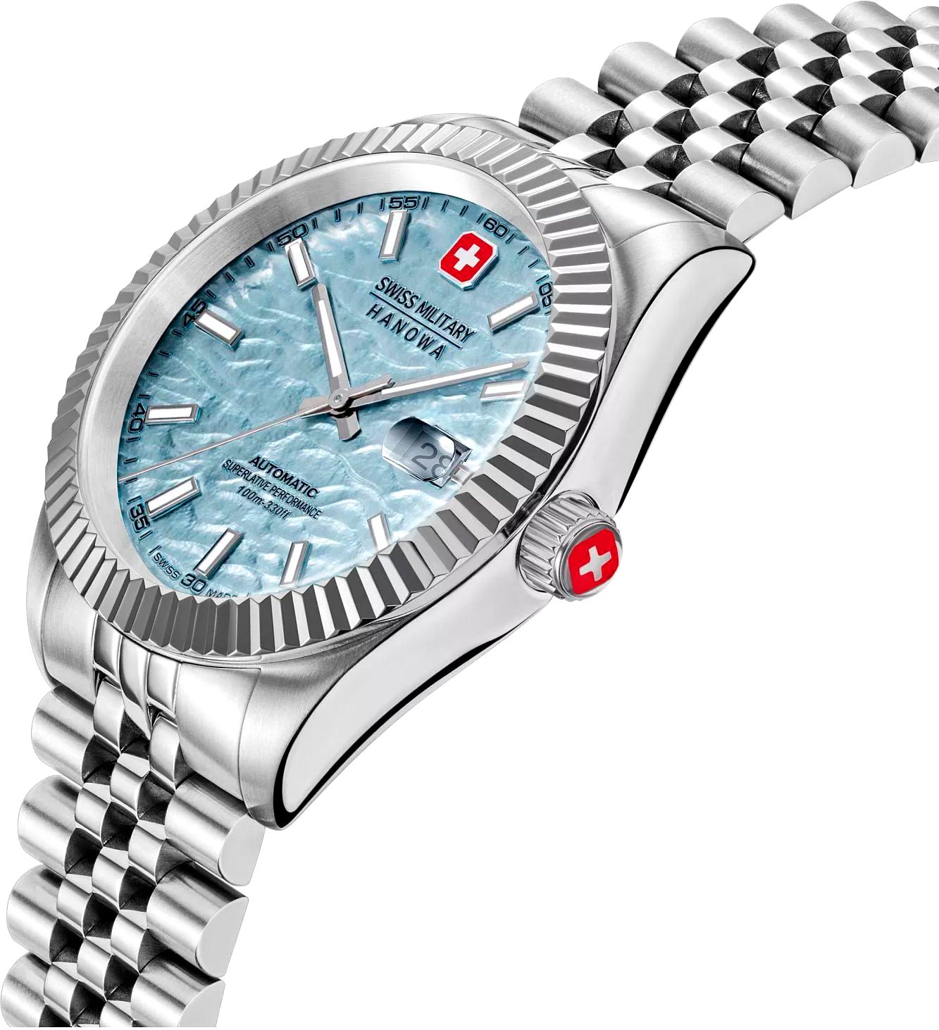Текстурированный циферблат защищен прочным сапфировым стеклом. Накладные метки в виде штрихов, фирменный логотип Swiss Military Hanowa в положении 12 часов. Окошко даты с увеличительным стеклом находится в положении 3 часа.