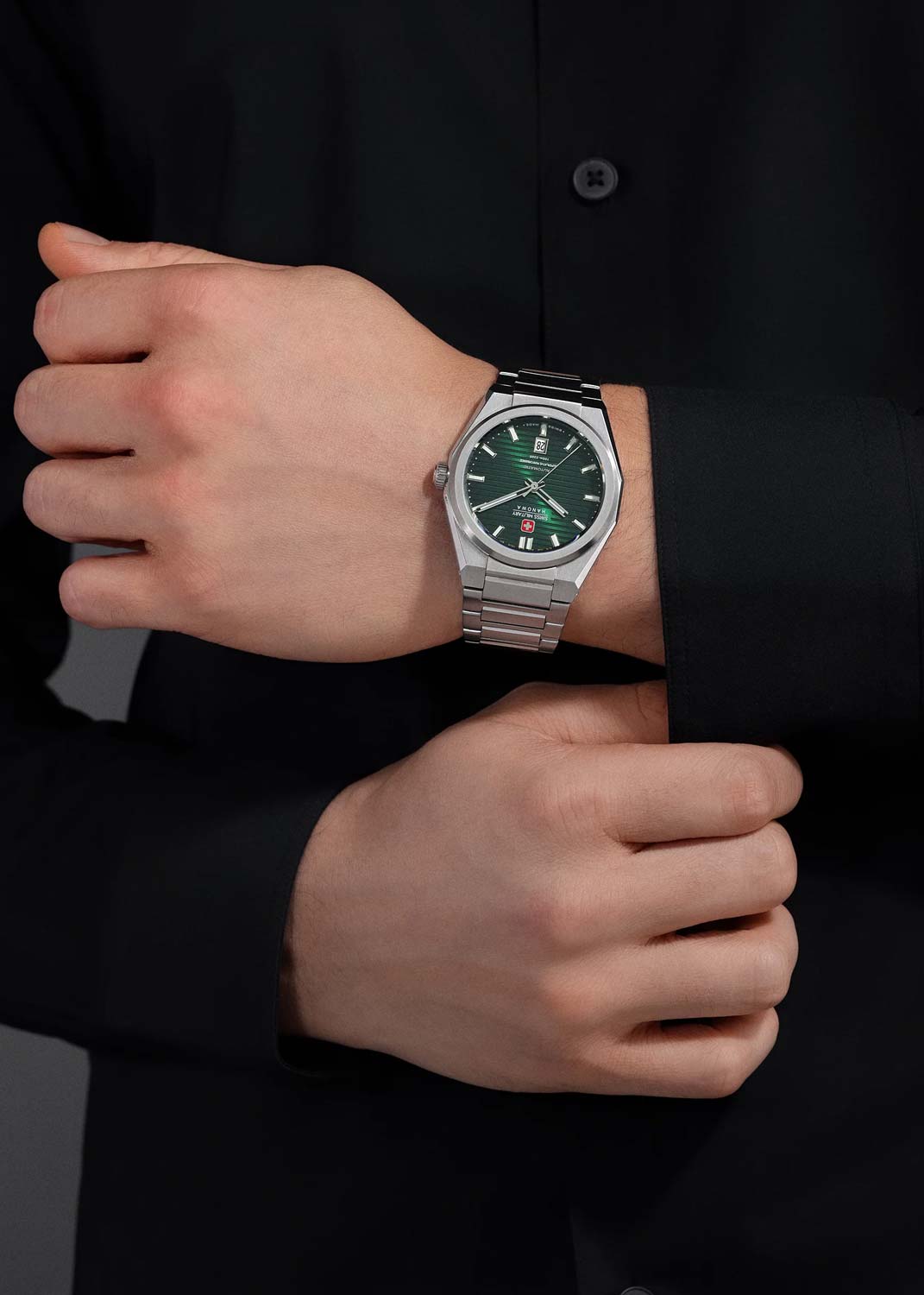 Стрелки и метки с люминесцентным покрытием, которое светится в темноте после непродолжительной зарядки на свету. Завинчивающаяся рифленая заводная головка украшена логотипом. Прозрачная задняя крышка. Стальной браслет с раскладывающейся застежкой.