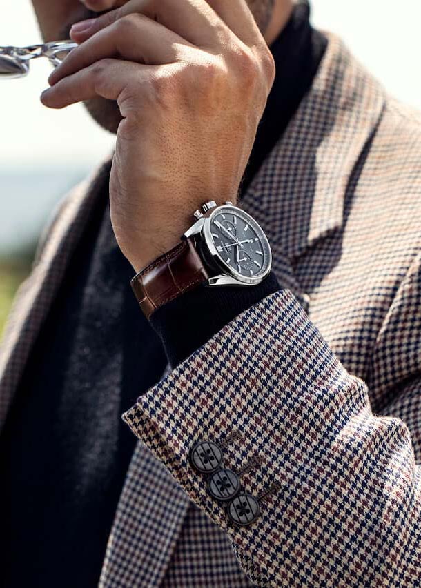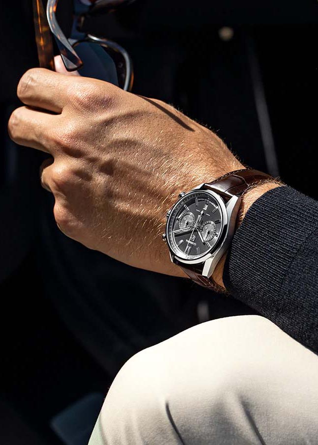 Carrera. Часы-хронограф с секундомером. Секундомер с точностью 1/4с и временем измерения 12ч. В механизме 33 камня, частота 28800 полуколебаний в час. Запас хода около 80 часов. Секундная стрелка вынесена на отдельный циферблат. Циферблат выполнен по технологии Sunray (солнечные лучи) и защищен прочным сапфировым стеклом. Метки в виде штрихов. Окошко даты находится в положении 6 часов. Рифленая заводная головка. Завинчивающаяся задняя крышка с сапфировым стеклом. Ремешок с раскладывающейся застежкой. Застежка с предохранительными кнопками. Дизайн вдохновлен автомобильными гонками, которые так любят настоящие мужчины.