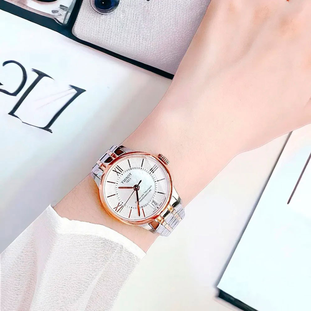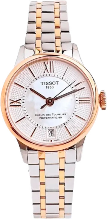Элегантность этих часов подчеркнет ваш современный образ, став верным спутником в мире стиля и времени. Наручные женские часы Chemin des Tourelles Powermatic 80 Lady. В механизме 23 камня, частота 21600 полуколебаний в час. Запас хода 80 часов. Круглый стальной корпус. Перламутровый циферблат украшен узором. Заостренные прямоугольные стрелки в стиле Baton. Накладные метки в виде римских цифр и штрихов. Окошко даты находится в положении 6 часов. Рифленая заводная головка. Надежный стальной браслет с раскладывающейся застежкой.
