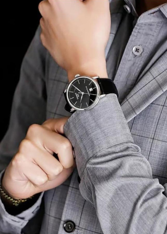 Рифленая заводная головка. Прозрачная задняя крышка. Кожаный ремешок с классической застежкой.