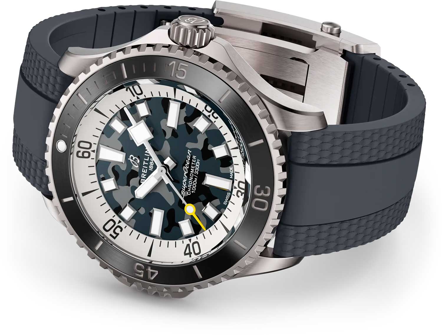 вставкой и блокировкой (специальный замок находится в левой части корпуса). Заводная головка с защитой и двойной прокладкой. Завинчивающаяся задняя крышка. Ремешок с раскладывающейся титановой застежкой и системой регулировки длины.