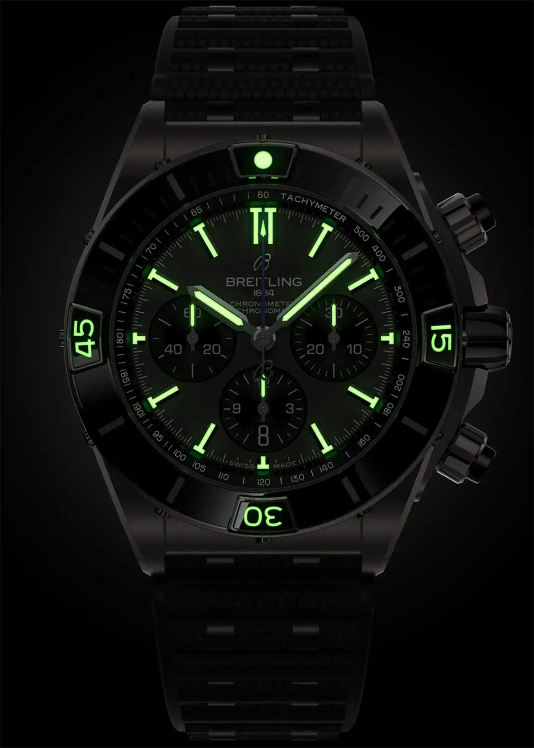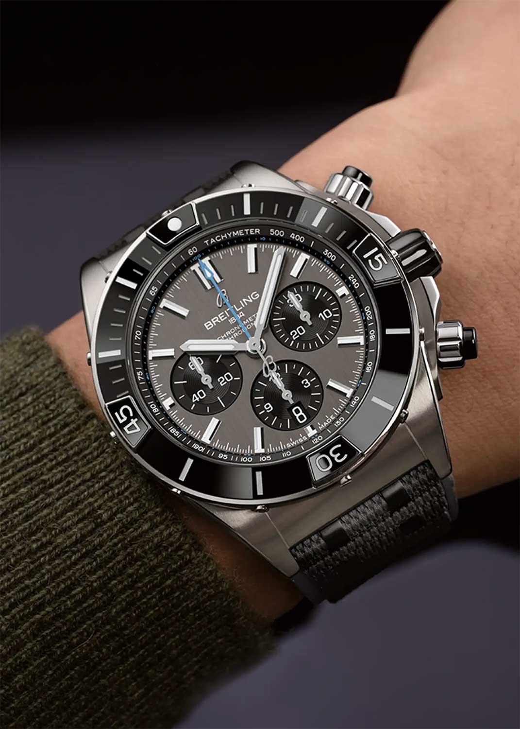 Super Chronomat B01. Вдохновением для создания модели послужила модель Chronomat 80-х годов, которая была разработана Breitling для летчиков пилотажной эскадрильи. В мануфактурном швейцарском механизме 47 камней,частота 28800 полуколебаний в час. Запас хода примерно 70 часов. Возможность ручного завода.Хронометр сертифицирован C.O.S.C.