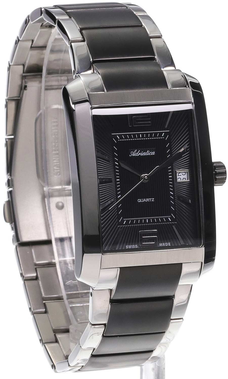Мужские наручные часы. Прямоугольный стальной корпус. Гильошированный циферблат с метками в виде штрихов и арабских цифр 6 и 12. Стрелки в стиле Sword. Окошко даты находится в положении 3 часа. Рифленая заводная головка. Браслет с раскладывающейся застежкой. Производитель оставляет за собой право вносить изменения во внешний вид часов.