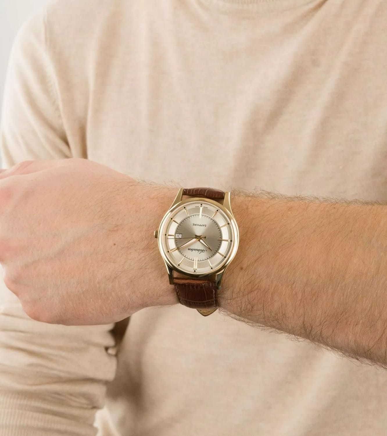 Элегантные, практичные часы с круглым корпусом на браслете идеальны для современного ритма жизни. Мужские кварцевые часы в круглом корпусе. Циферблат защищен прочным сапфировым стеклом. Метки в виде штрихов. Окошко даты. Рифленая заводная головка. Кожаный ремешок с классической застежкой.